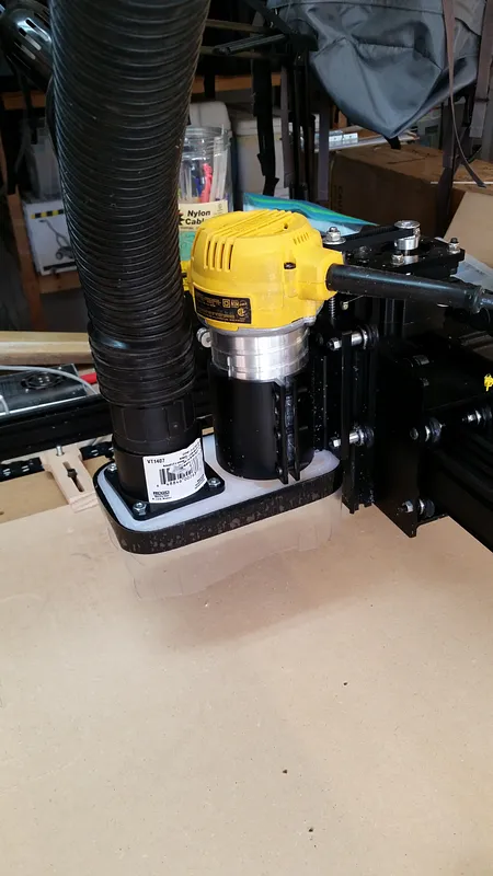 Air diverter and dust shoe for Dewalt 611. I carved this out of a 1/2" thick plastic cutting board. The carve took about 3 hours with a 1/8" bit. The vacuum adapter is a Rigid Universal Tool Adapter VT1407 available at Home Depot.