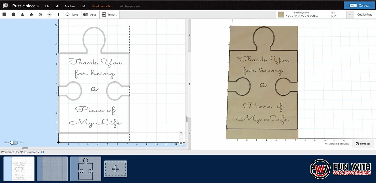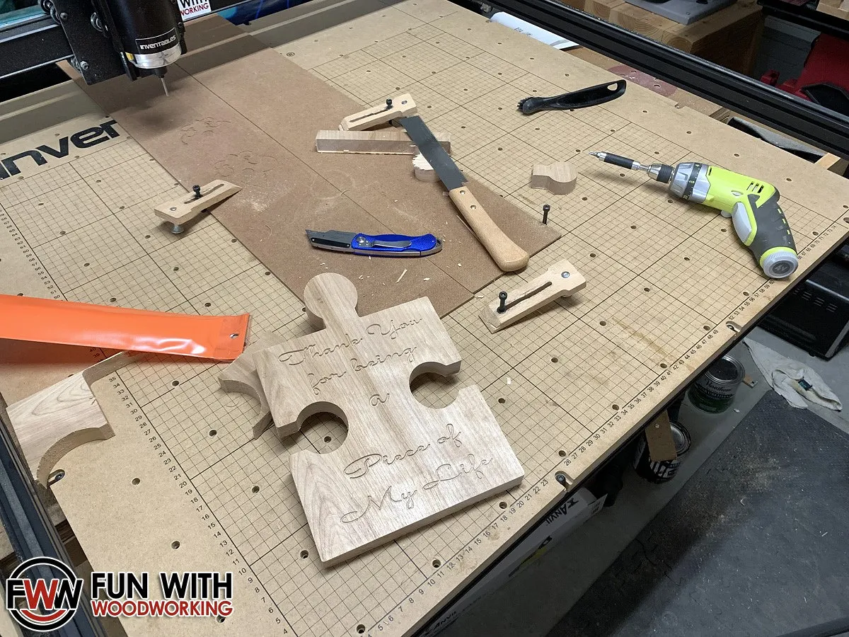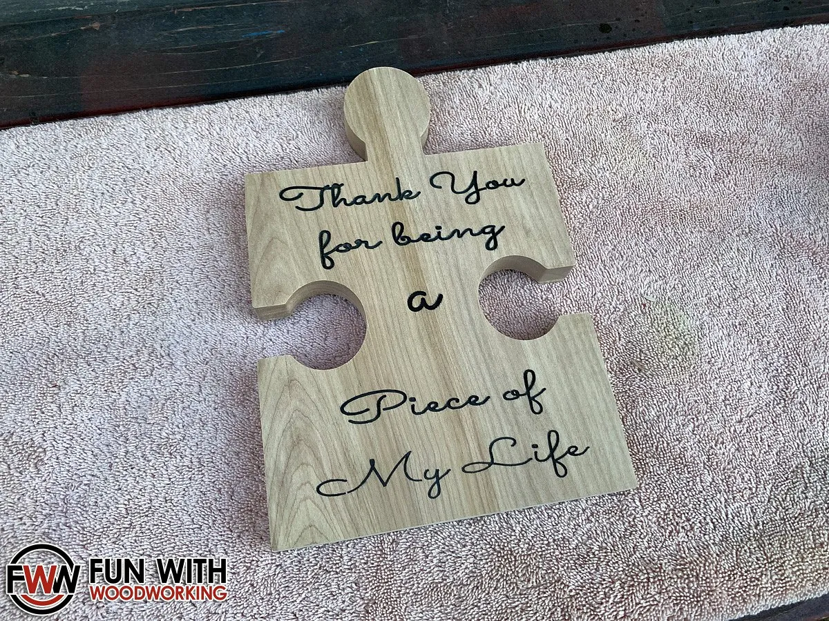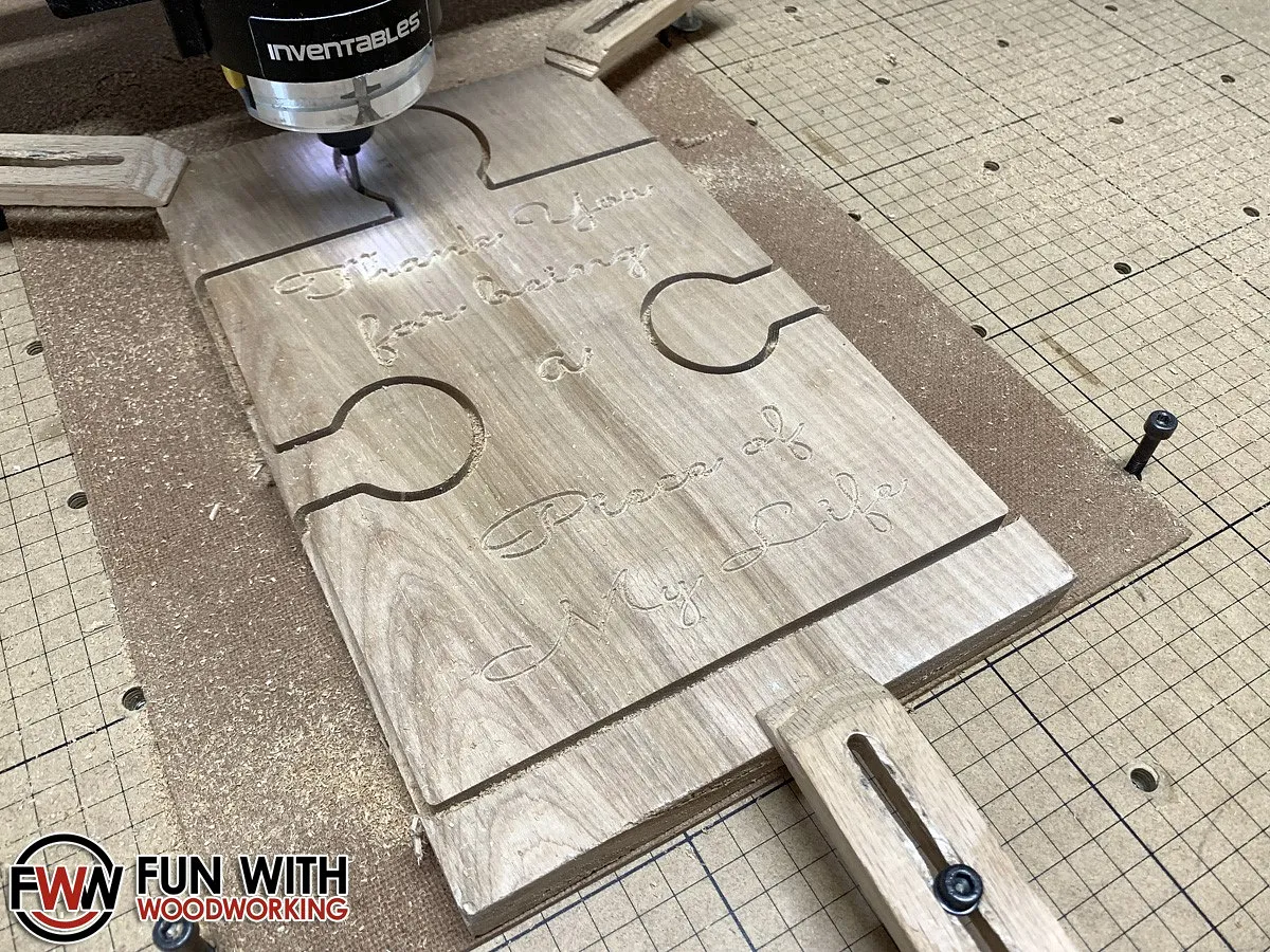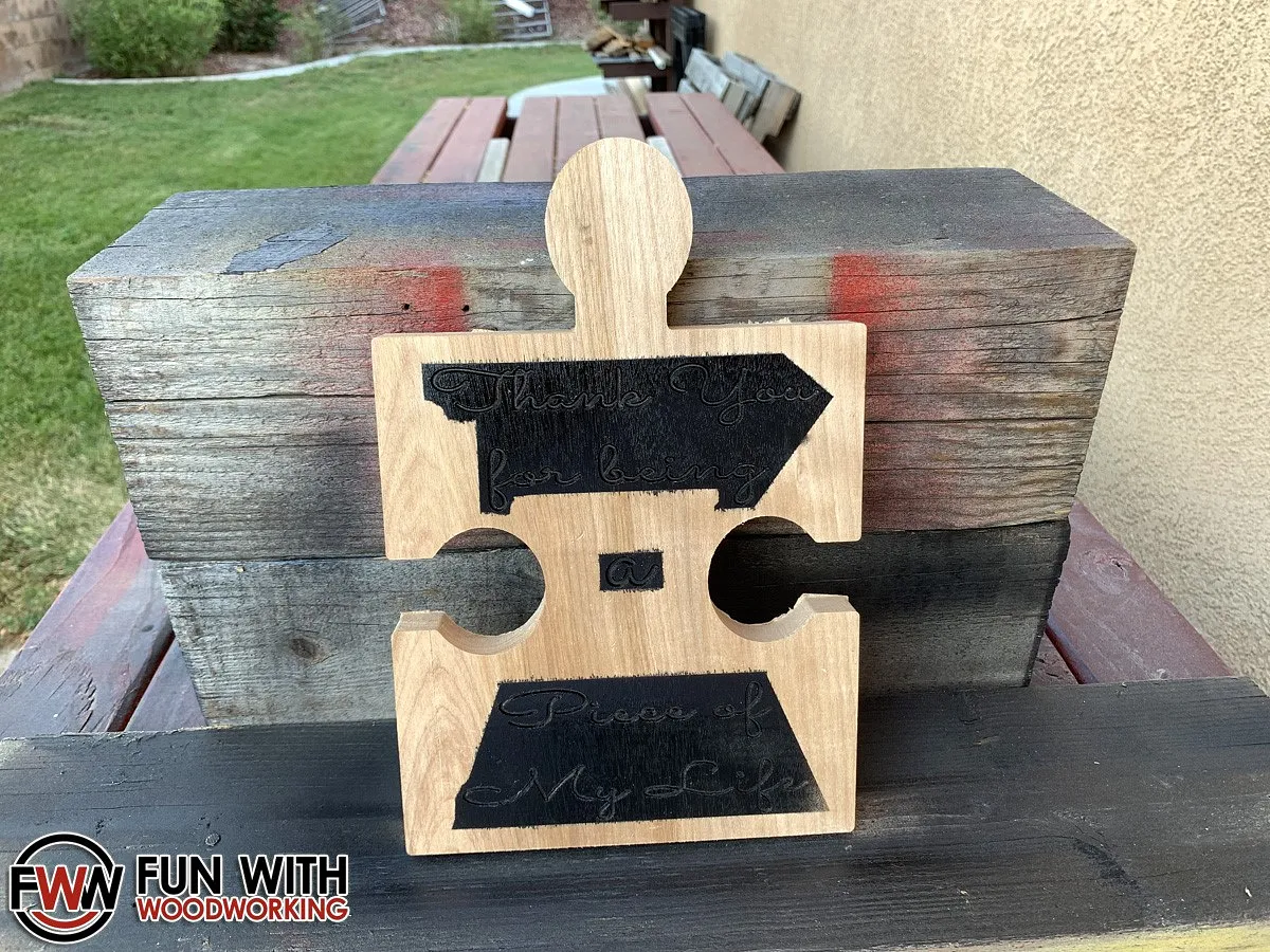 I imported it into Easel, removed the bottom cutout, and resized it to my wood dimensions. I then added my text and made 2 copies. The first copy was for the text to be carved with a 60° V-Bit. The second copy was to cut out the puzzle shape using a 1/8" 2 flute bit.
