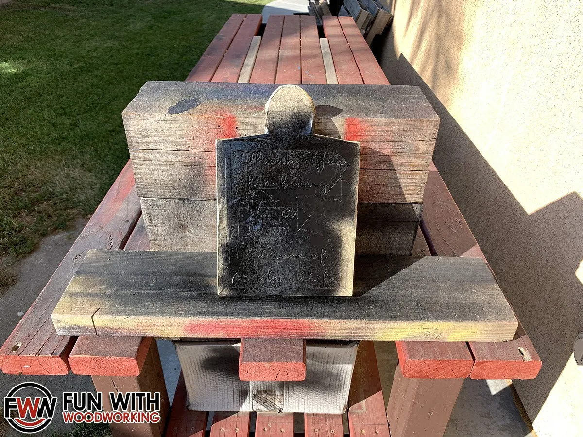 I masked off the text to lessen the sanding time and then gave it a good coat of black spray paint.