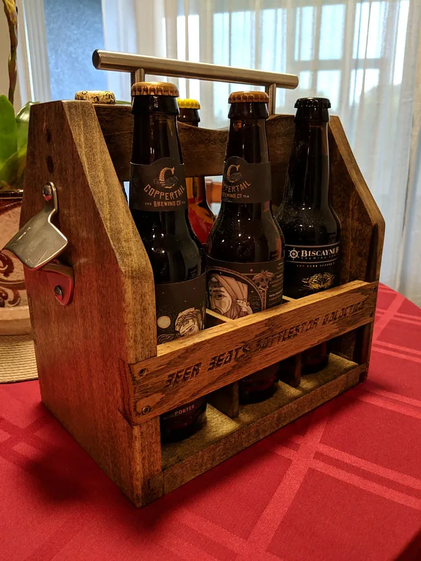 Simple Christmas gift for a good friend. Personalized a beer tote i made out of Oak and Ash and Poplar.