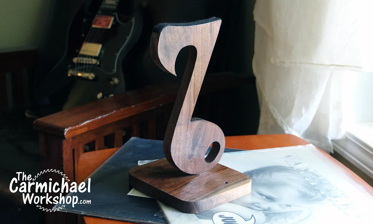 The top of the stand is shaped like a music note. It has a hole for the cord and a tenon to glue it to the base. The tenon is designed to fit into a 3/4" square mortise in the base. If using lumber with a different thickness, adjust the size of the mortise in the base.