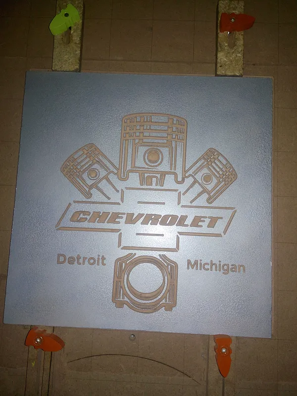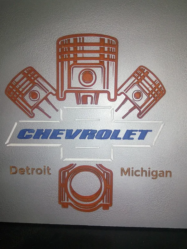 A classic car sign, like the ones that belong in a man cave. MDF board painted with hammer tone spray paint. And then color filled and sealed with clear lacquer.