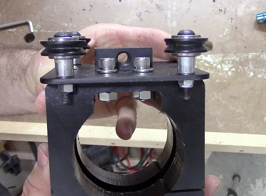 Finally you can install all the hardware on your mounting plate (v-wheels & delin nut). Then you can install the clamps by using 1/4" socket head bolts. they have to be socket head so there is enough room for the thread rod to clear. check out the video if you looking for duct collection ideas!