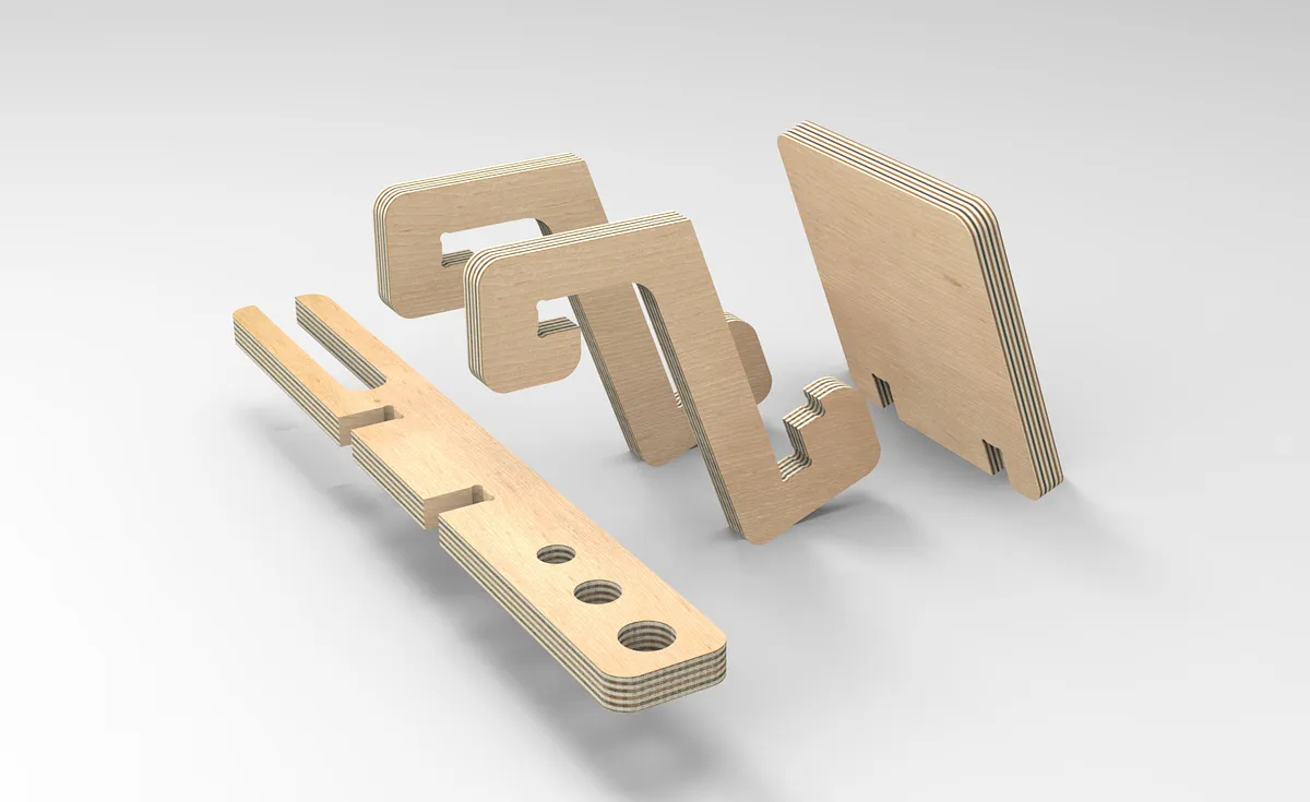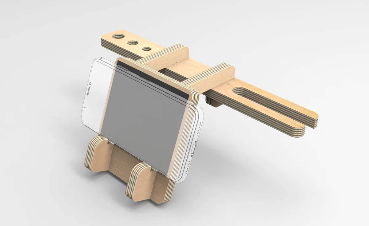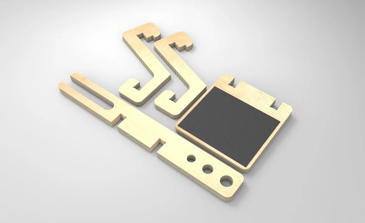 Once cut on the x-carve, the mount is easily assembled by means of a slotting system. A section of micro suction tape is then adhered to the large rectangular back plate surface.