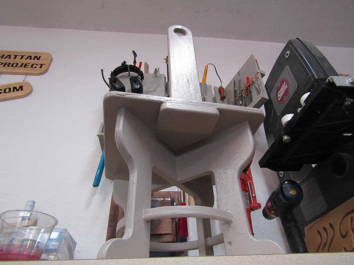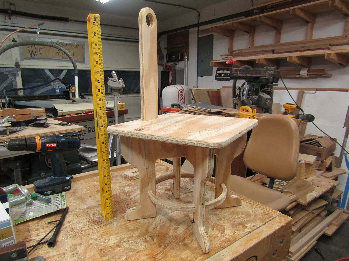 Glue the handle into the stool, then glue the handle support on the bottom of the stool seat. Clamp and allow to dry. If desired, brads or nails may also be added to keep the handle in the seat and the handle support in position.