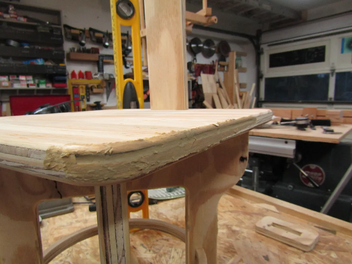 If gaps are present due to missing pieces in layers, fill gaps with wood putty (or wood glue and sawdust if stain is not going to be used) and sand smooth. Since I planned to paint my stool, I used liquid nail to fill the gaps.