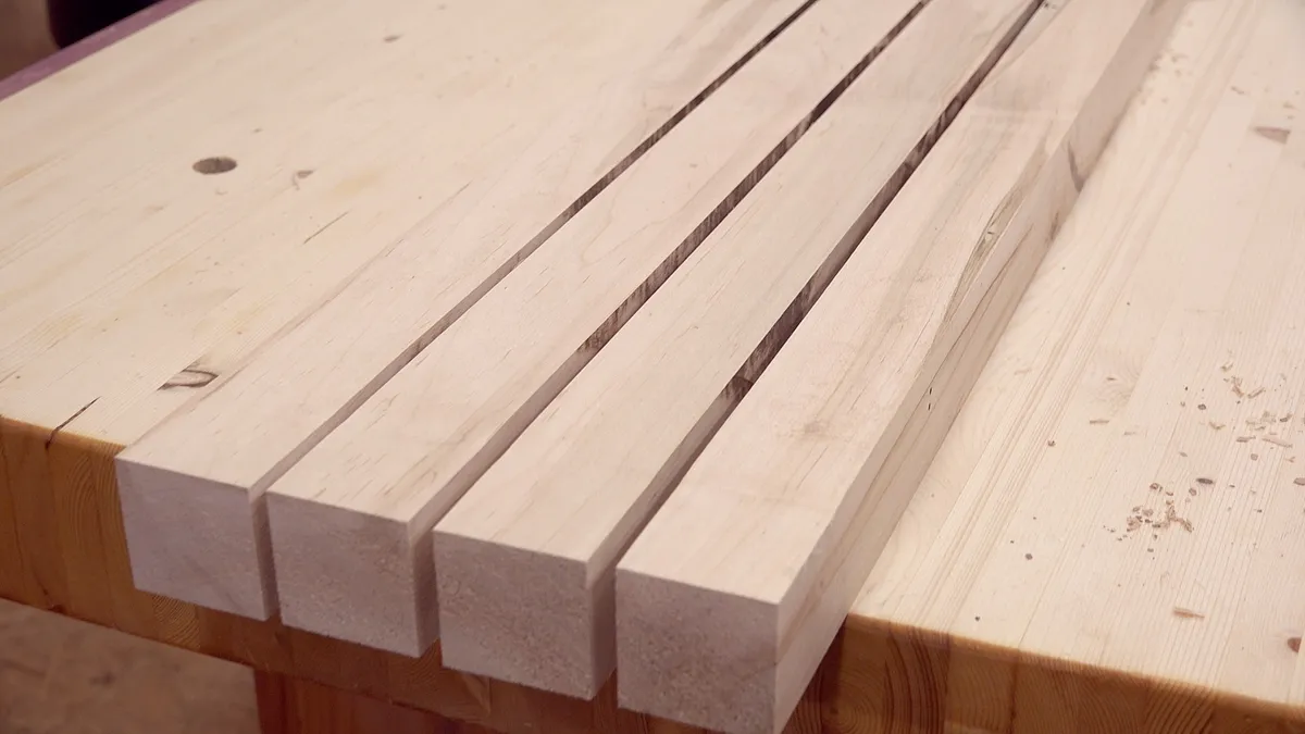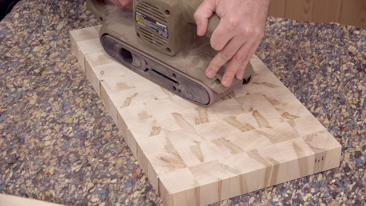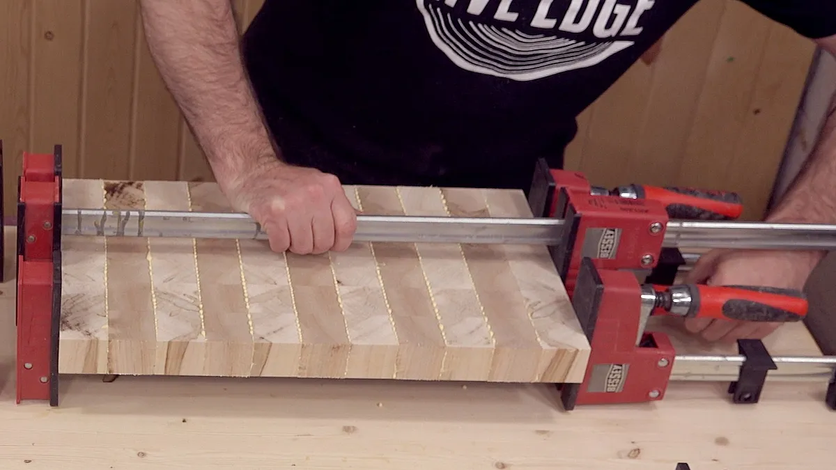 Once the glue dries cross cut it into 1 1/2" strips. This will be the thickness of your cutting board. Then glue up these strips with the endgrain on the top and bottom faces.