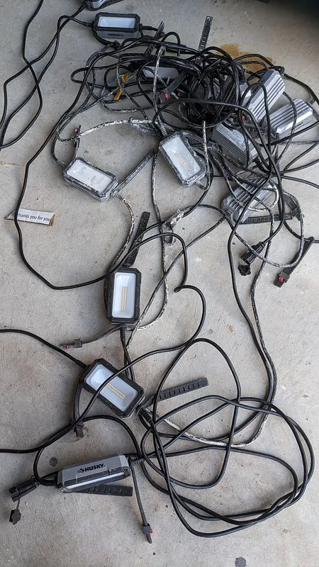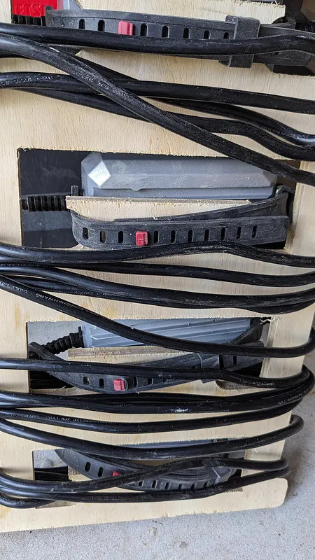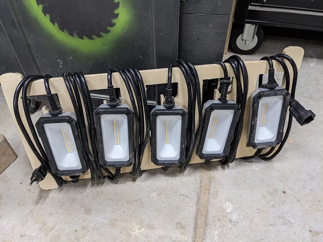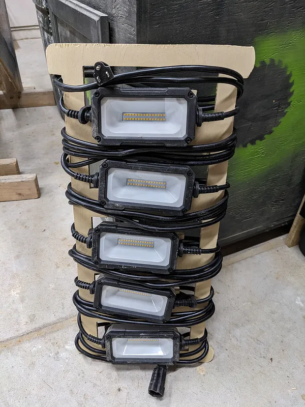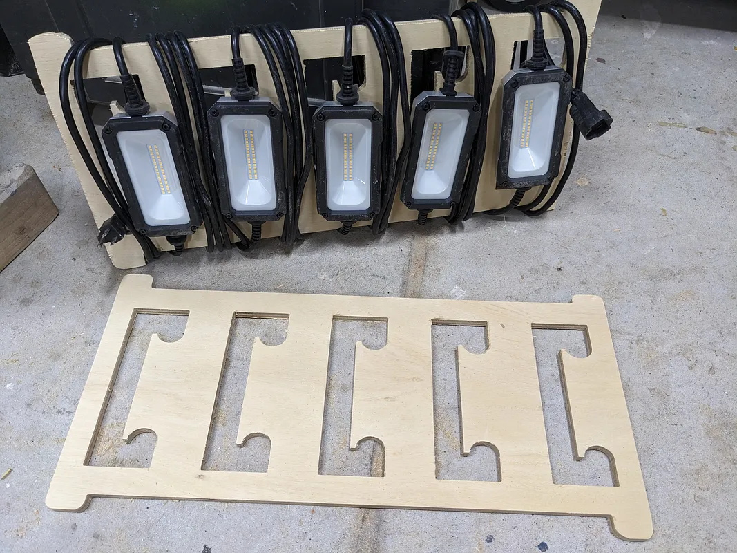 I needed a way to organize my easily tangled string work lights; so made this reel to hold the lights in place and wrap the cord. I can unravel the reel or use the lights directly on the reel. This was cut from 1/2" plywood on an M2 Maslow machine with a 1/8" bit.