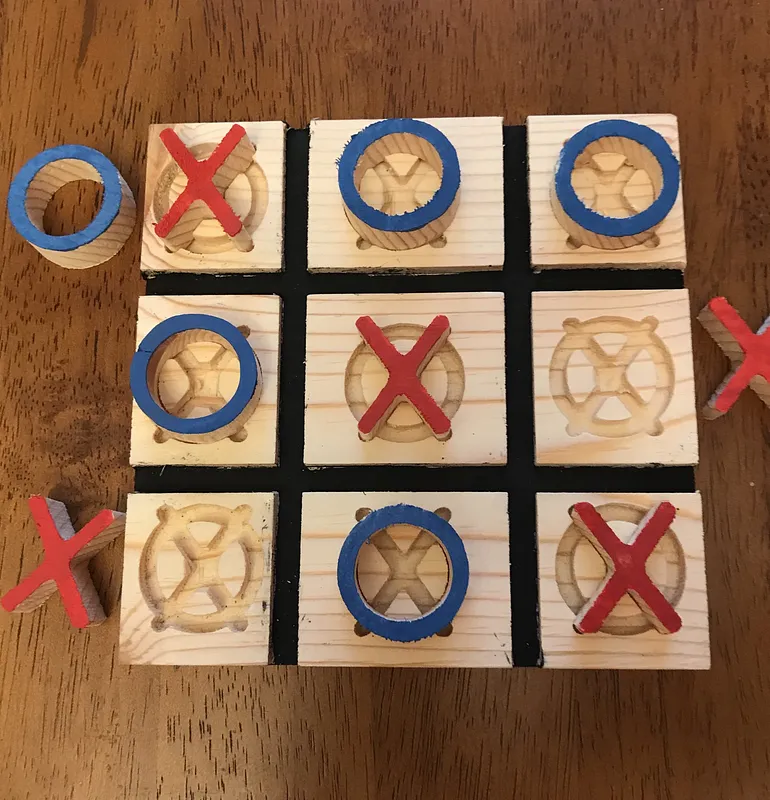 This tic tac toe board and its pieces can be cut out in 43 minutes using the provided settings.
