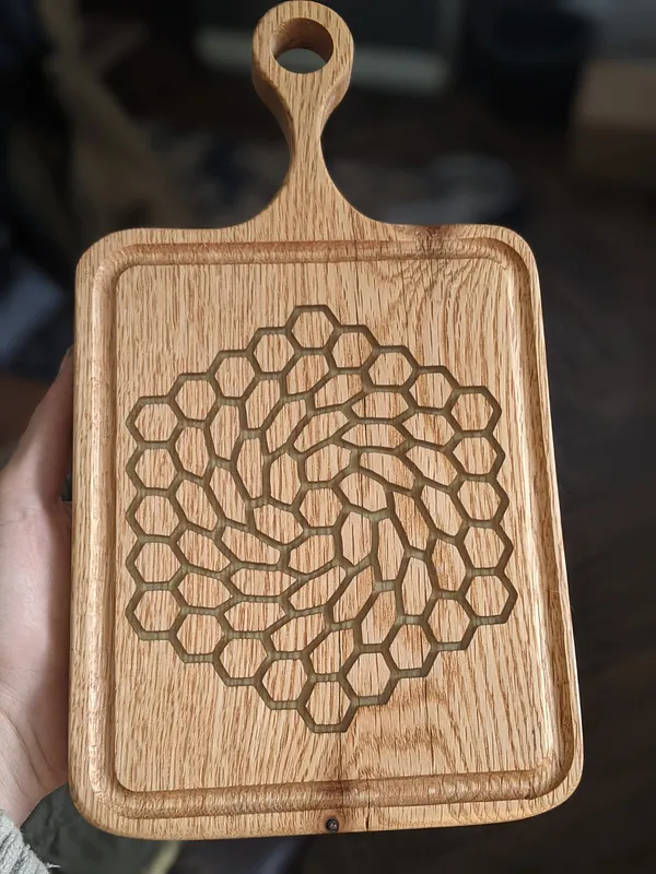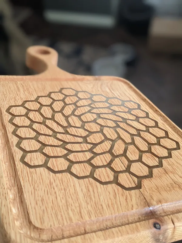 Charcuterie or cutting board. It has some hexagons I designed that swirl counterclockwise 60 degrees.