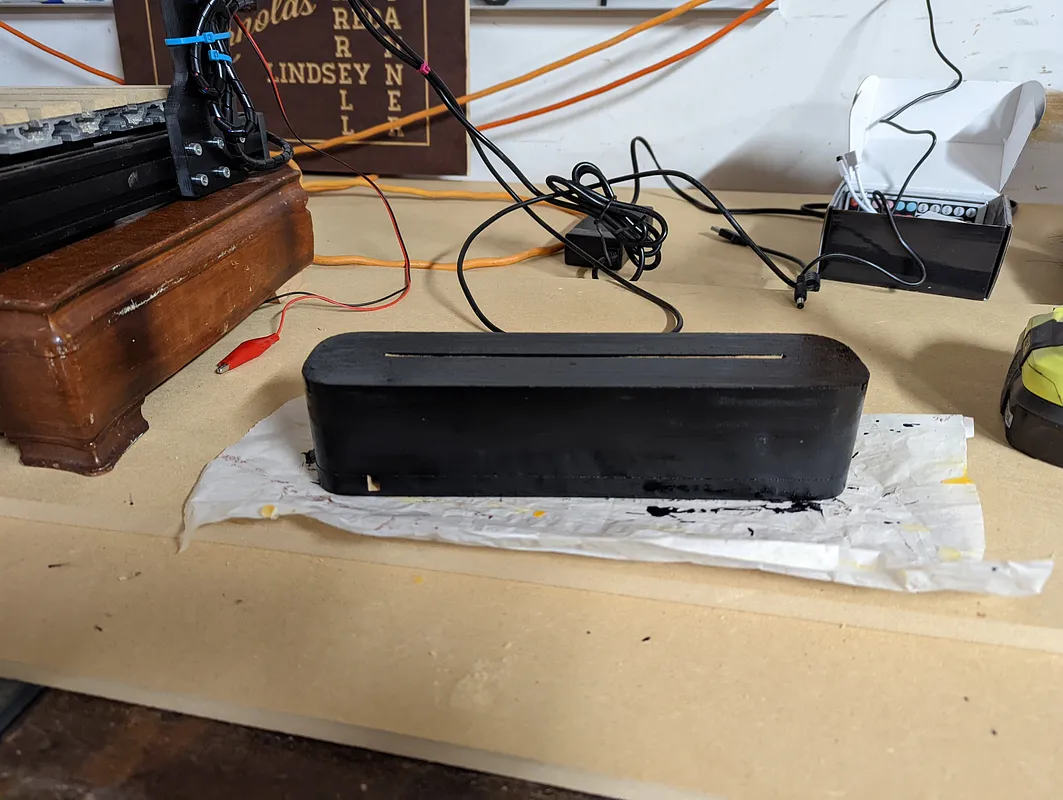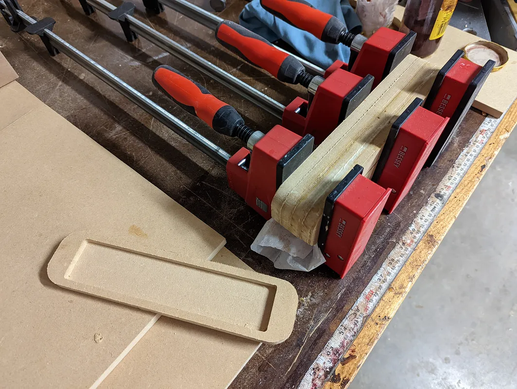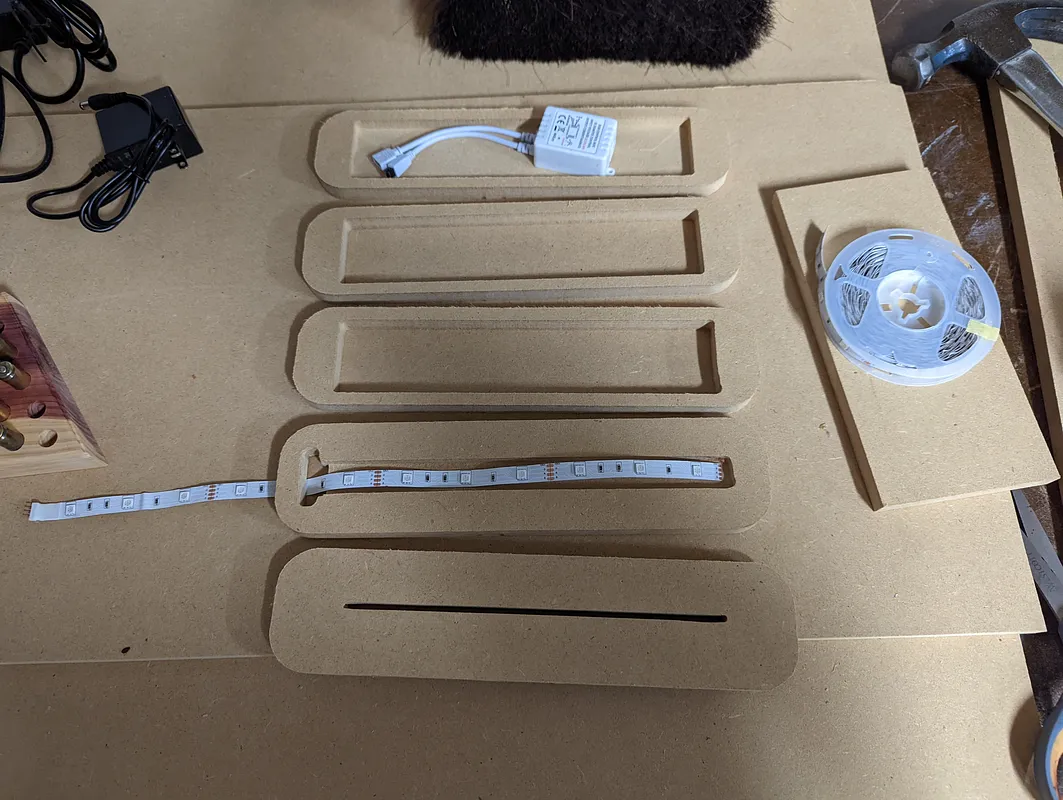 Clockwise from top: middle piece, top, LED strip piece that goes directly under the top piece, base for the bottom. Run workpiece 1 then leave material on CNC and cut the 2nd piece. The notches on the bottom piece are for the remote receiver and power cable. "DAYBETTER Led Strip Lights" on Amazon.