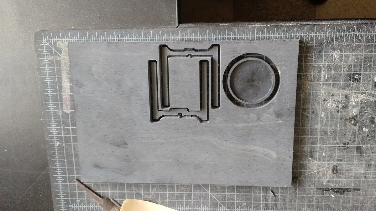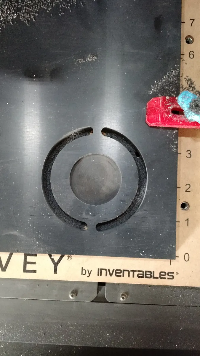 For this step you will want to flip the corian sheet over and align it to cut the reverse side of the circular puck part. This recess is to allow room for the joinery between the legs.