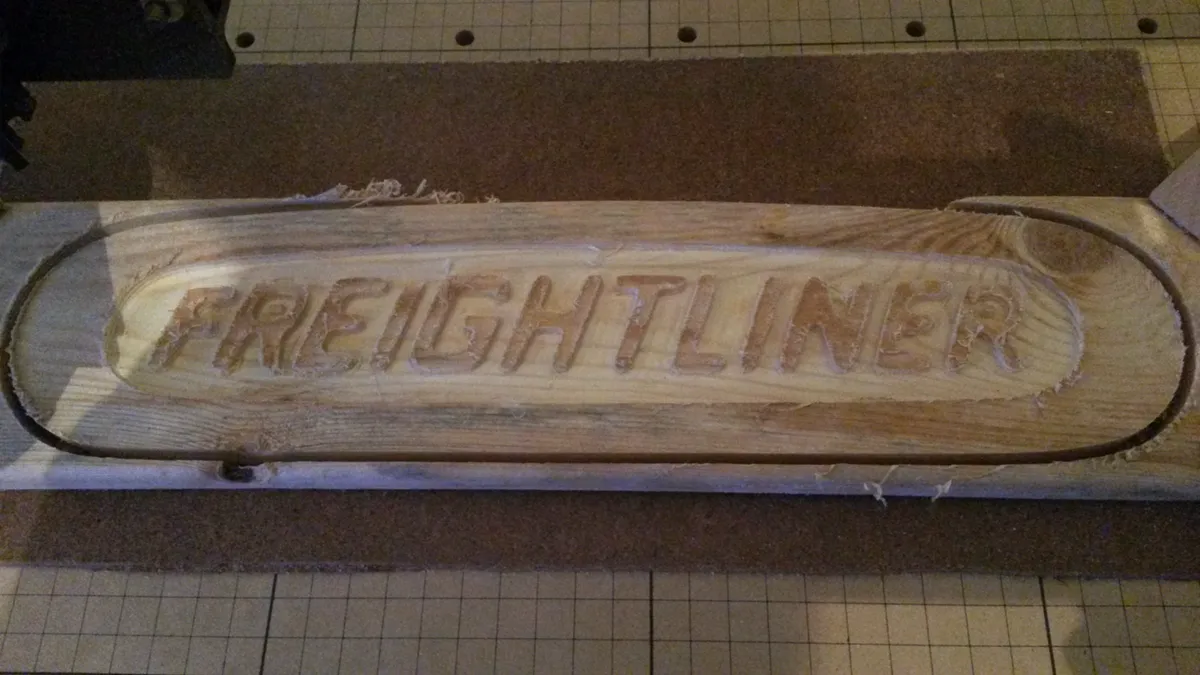 Saftey Height: .150" Step over: 40% Feedrate: 45 in/min Depth of cut per pass: .0625" Depth of total cut letters: .110" Depth of total cut Outside: .748" material thickness: .748" Material type: Pine Wood Bit Size: .125" Bit Type: solid carbide 2 Flute straight flat end mill