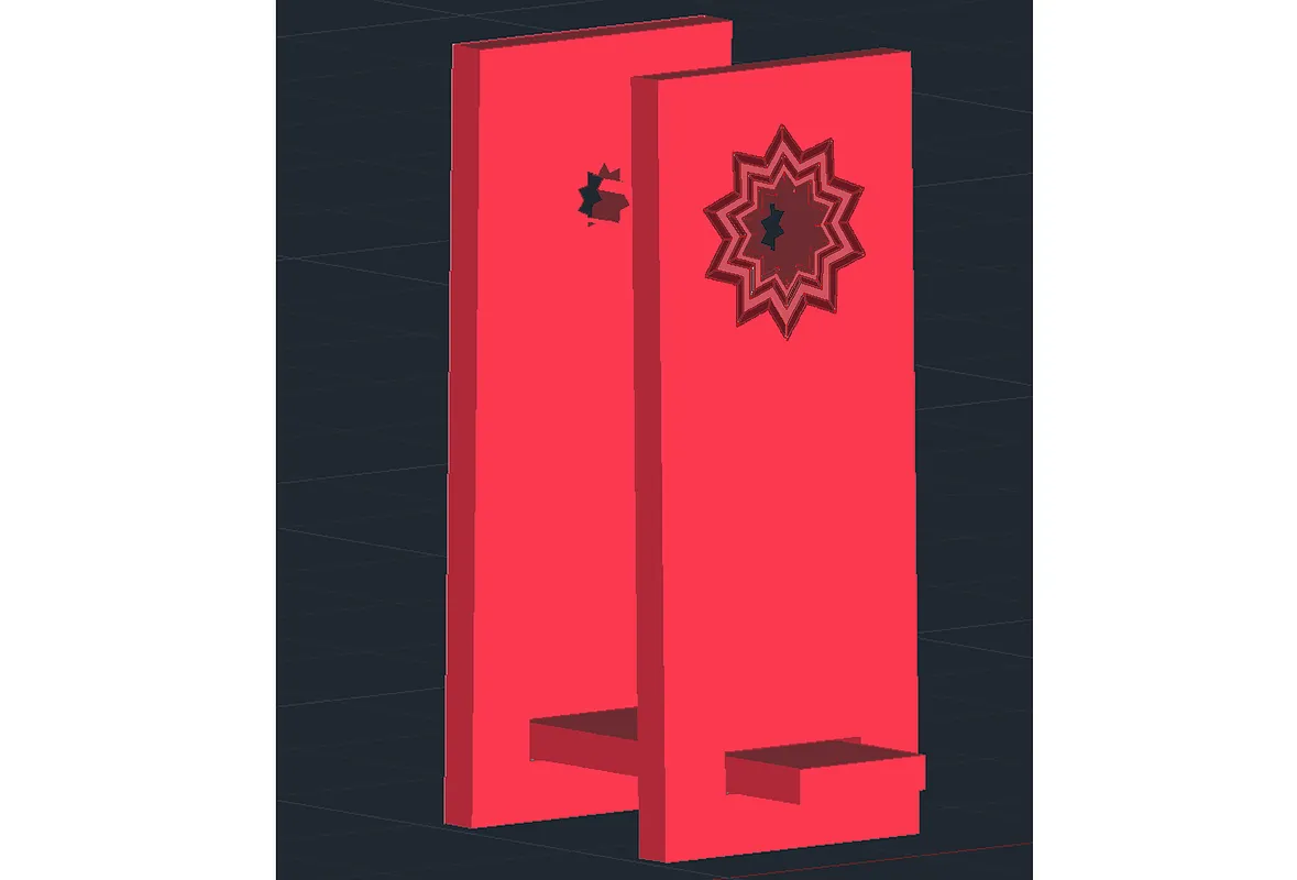 Three pieces in bubinga wood. Two main ones have a star-shaped design with ten points. The third piece is a ribbon that fits in the slits that have the two main ones and makes it possible to move them, creating a structure that allows to deposit books on it.