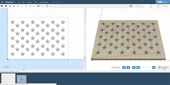 For a 19.5"x37" flag, the panel for the stars is about 15" wide and 10.5" tall. This can vary a little depending on the actual height of the top seven stripes. Just measure the height of the stripes and cut the height of the panel to match. You may need to adjust the dimensions in the EASEL project if your panel is slightly different.