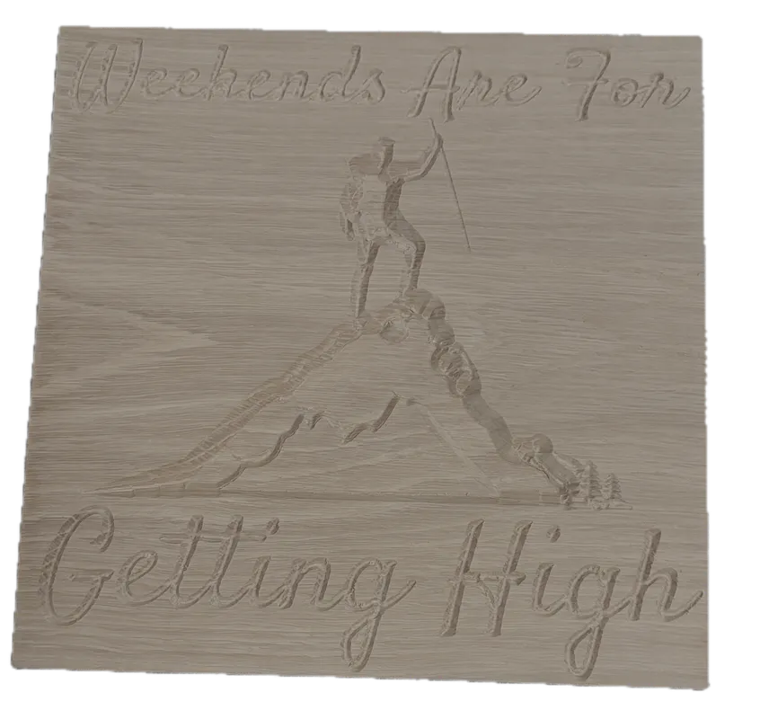 A v-carved sign with an image of a hiker on a mountain peak, and the cheeky text - "Weekends Are For Getting High"