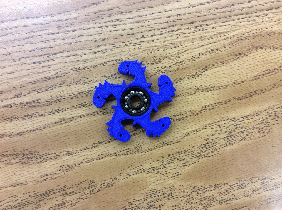 This was made as part of a CAD project at Weaver Middle School. This is a fidget spinner with five dinosaur heads sticking out of the center. Each dinosaur has an eye, mouth, tail and spikes down its back.