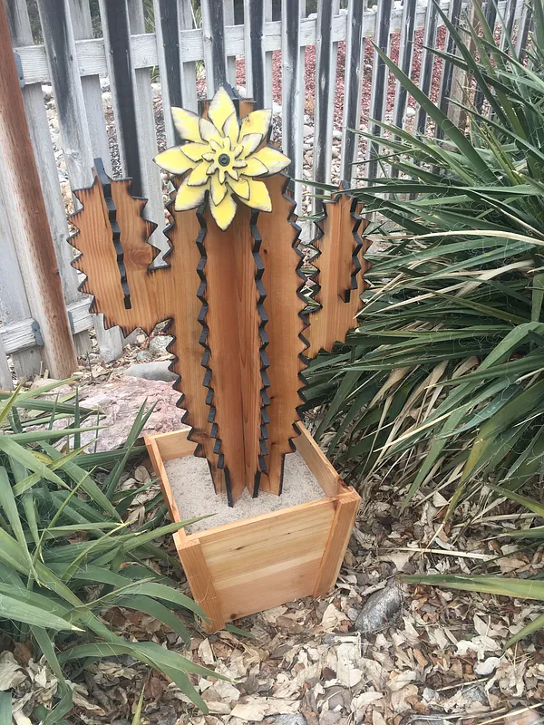 Outdoor cactus yard ornament made of cedar wood and cut out with my x-carve. It stands 38 1/2" tall total with the planter box. I cut out each section and then pieced it together. It was a fun project!