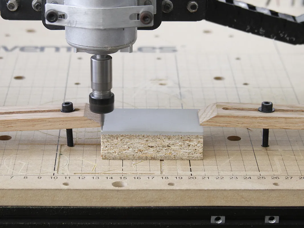 Clamp your piece down as square as you can (don't worry too much) and keep the clamps as close to the edge of the linoleum as possible. When it's secure zero your machine. Try for something like this:
