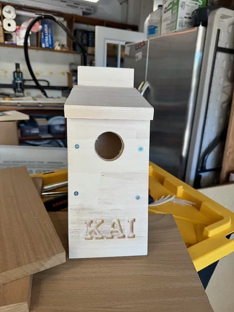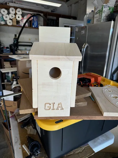 This is a basic birdhouse with a customizable name. I also used a saw with a 20 degree angle to make the roof fit better. I used poplar .75. Feel free to make personal adjustments. I made one wider than the other. Have fun and stay safe.