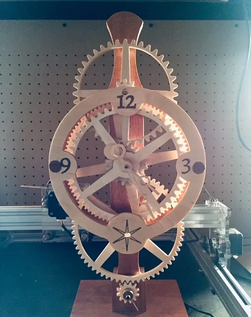A small gear clock that can be driven either by a stepper motor and arduino; or with a 1 rpm electric clock motor. 2 variations of the clock are pictured.