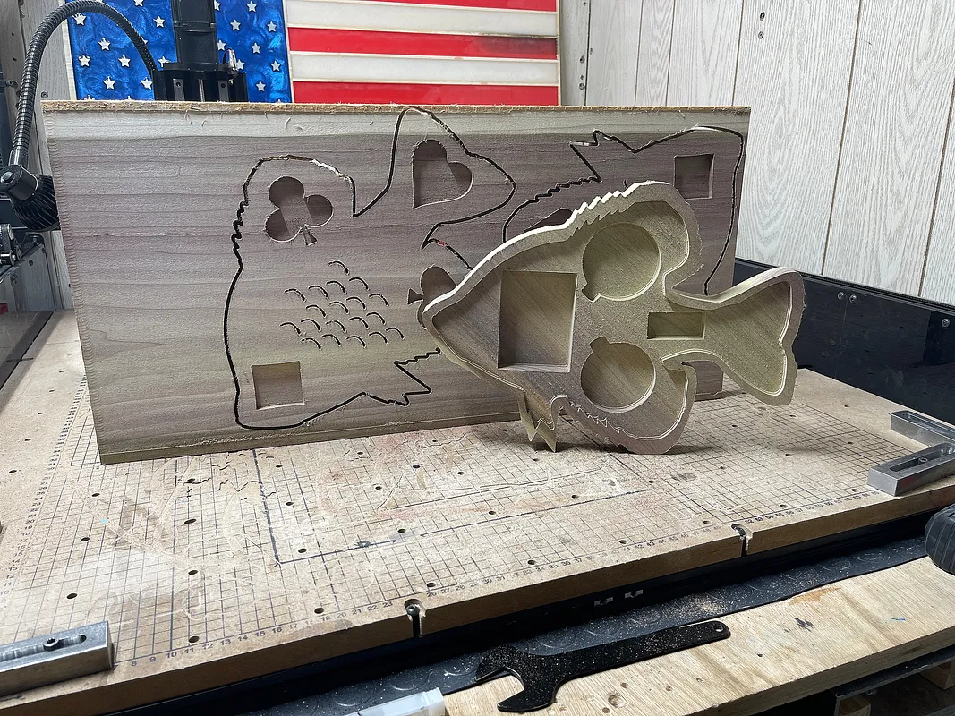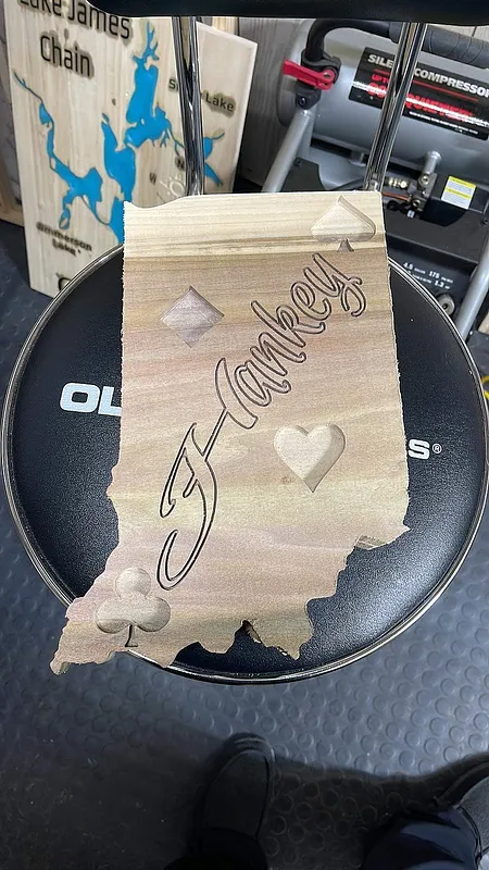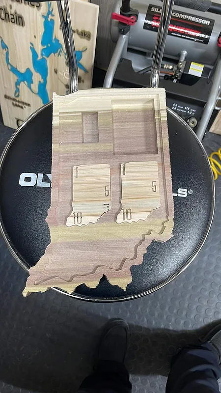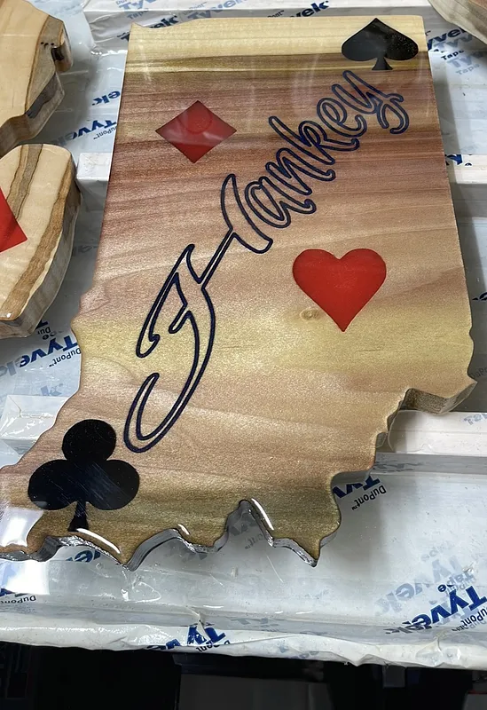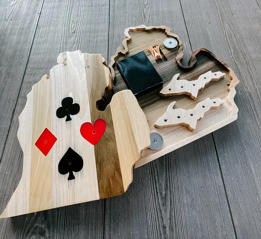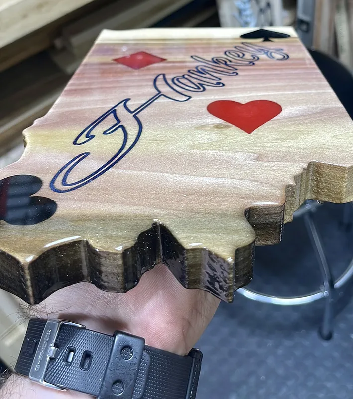 Euchre card box. I carved suits on the top for those that need help keeping track (you know who you are). Inside spots for cards, score keepers (small state cut outs) and pins for suit and keeping score. All epoxy filled as well as the final seal coat. Magnets hold the top on.