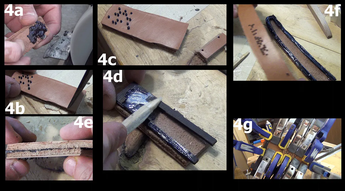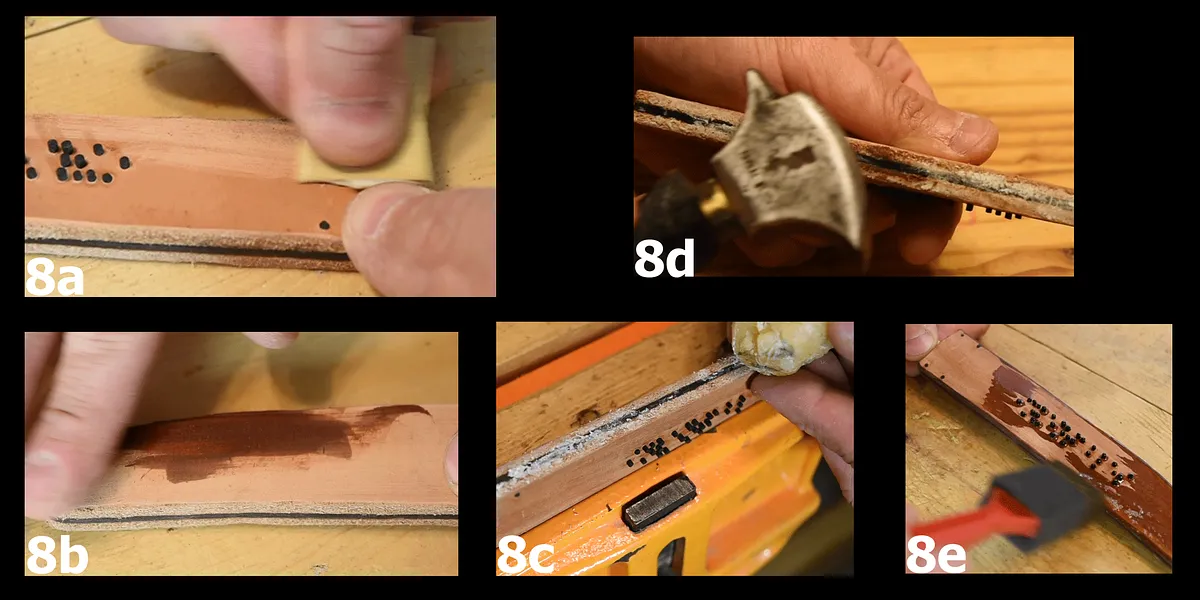 Three coats of shellac were applied onto the top grain side and edge of the leather (8e). The shellac was allowed to dry 5h between coats and 24h after the last coat.