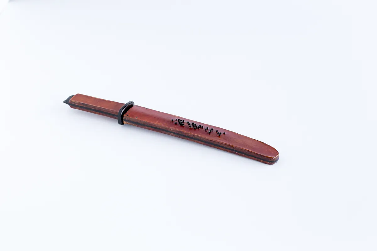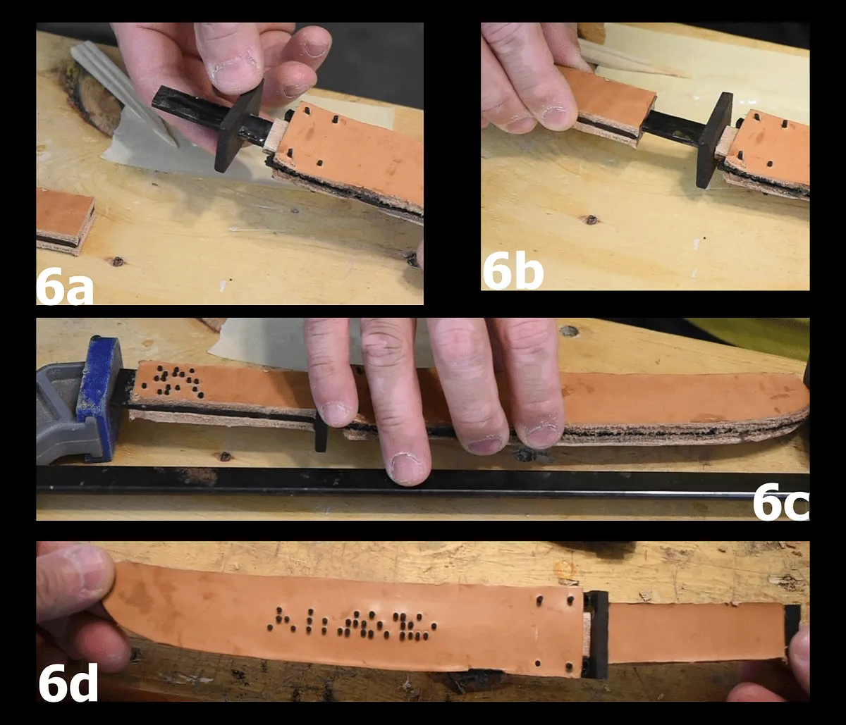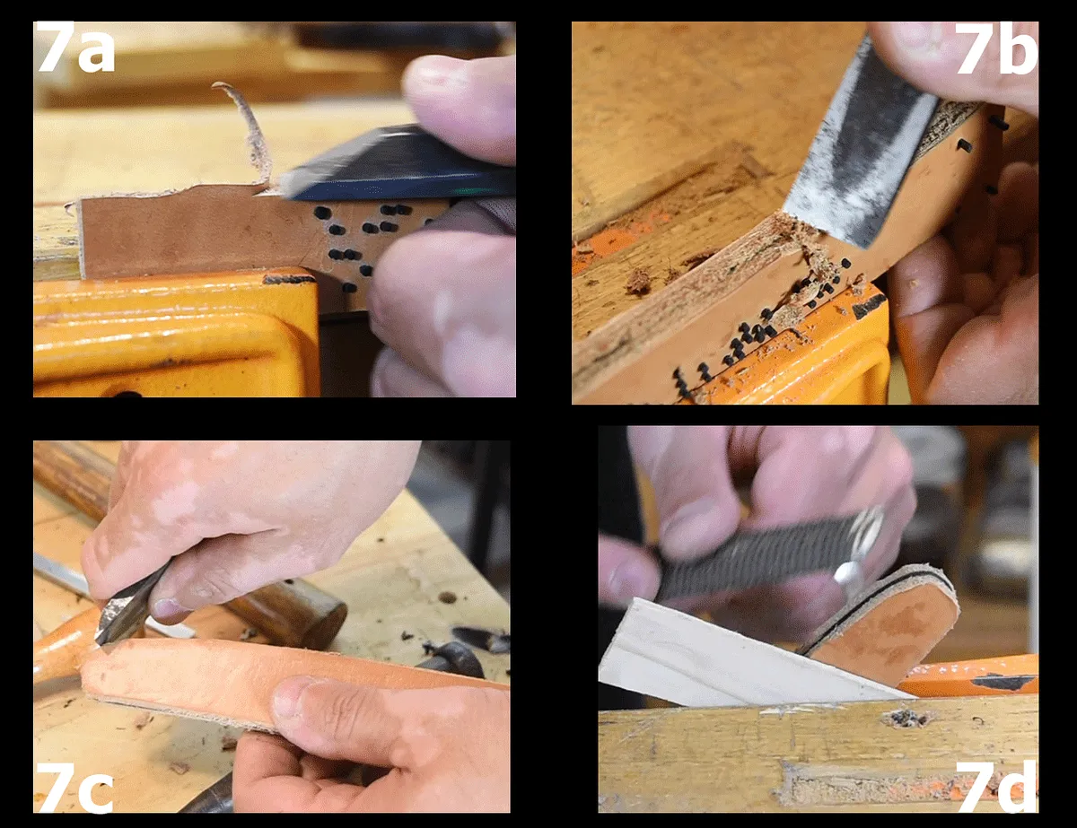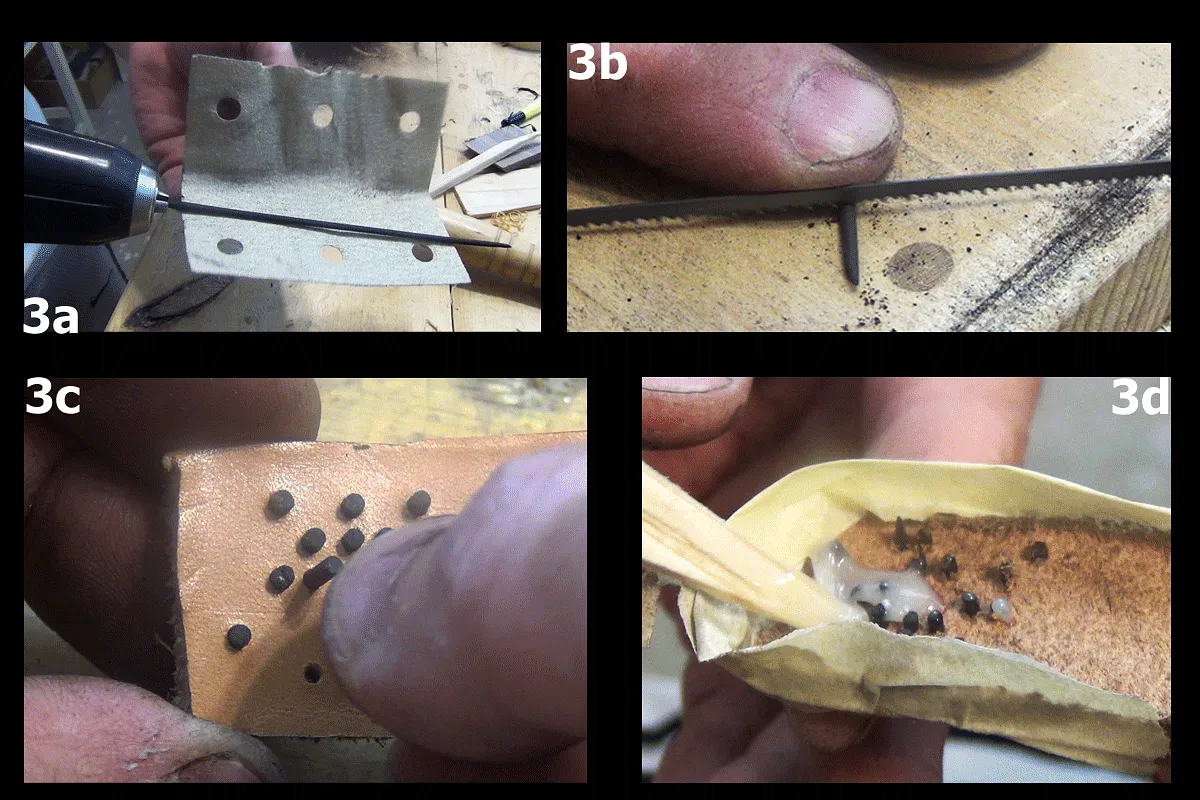 The lack of a back board left with some of the details on the leather and ebony pieces uncut. The Braille details on the leather pieces were poked out with an awl (1f) and a drill. The uncut ebony parts where cleaned out with a knife and chisel (1g).
