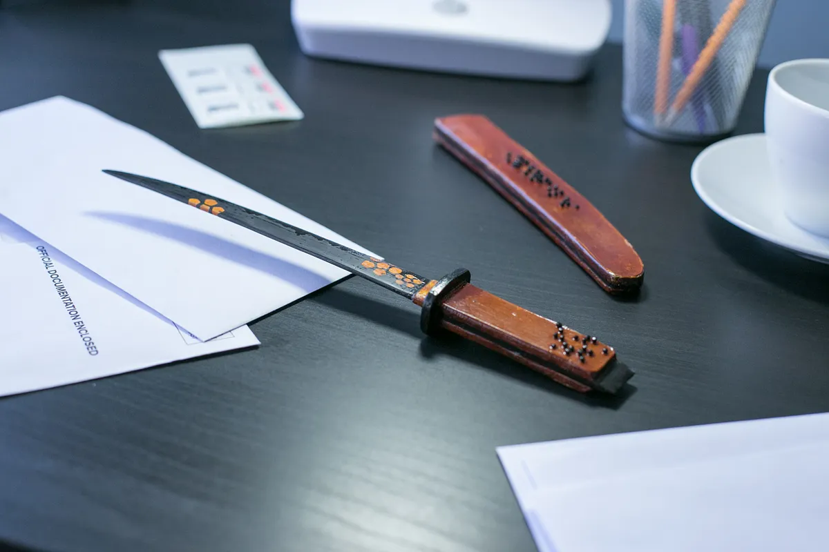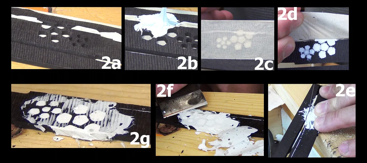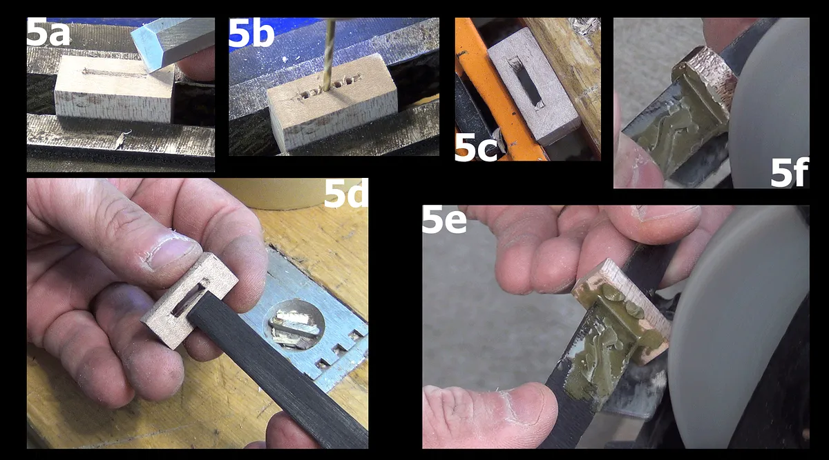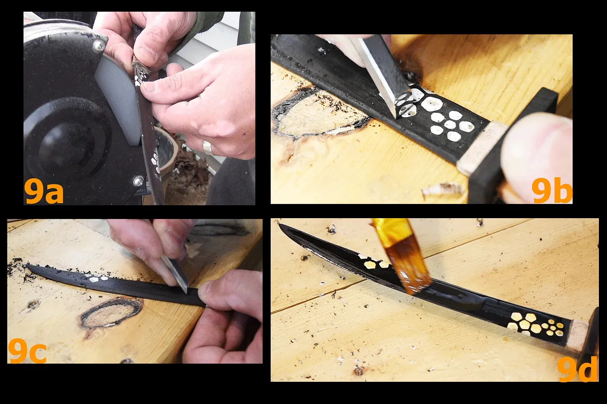 The lack of a back board left with some of the details on the leather and ebony pieces uncut. The Braille details on the leather pieces were poked out with an awl (1f) and a drill. The uncut ebony parts where cleaned out with a knife and chisel (1g).