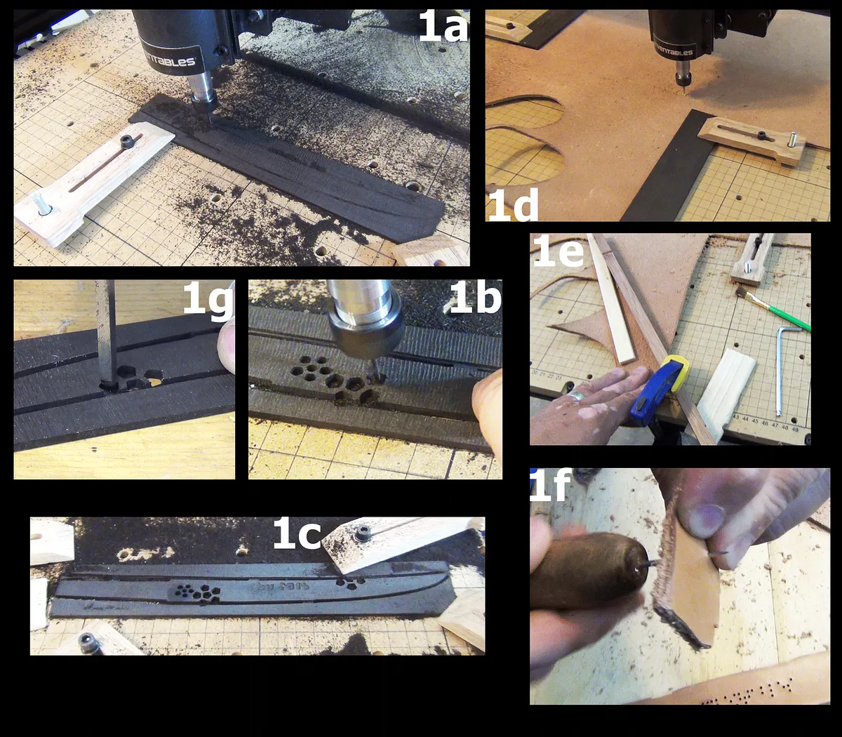 The vegetable tanned leather was about ¼” thick, but it is inconsistent in it’s thickness (1d). There needs to be abundant clamps to ensure the leather does not flop around when cutting (1e). I did not put a back board under the leather. I would advise in putting a back board under the leather, and set the depth of the X-Carve to make sure it cuts into the back board. The leather is cut from the suede side (cutting from the top grain side will cause the leather to tear. Leather is easy for the X-carve to cut, so set the speed and depth to one of the presets for any of the softer wood.