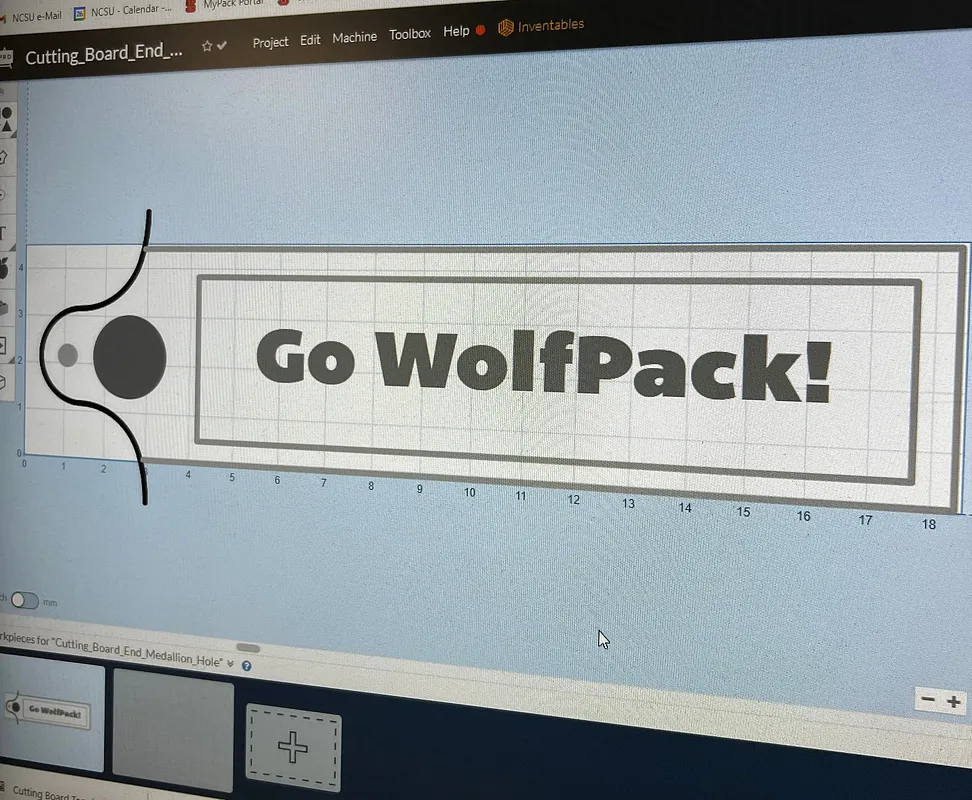 Please use this project template for your Pack Snack Platter. It will scribe the long sides and end and cut through for the handle with a straight cutter. You will want to use your own lettering and possibly choose a different cutter as well (v-cutter)