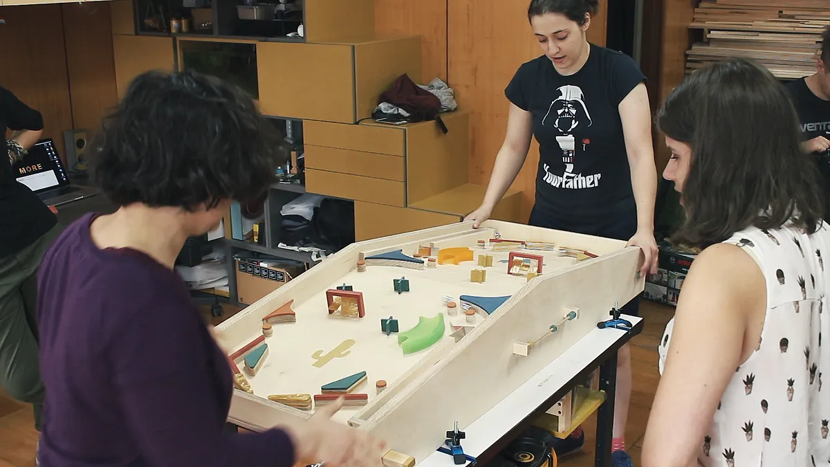 My boards ended up with 70 x 53 cm and the overall size of the machine is 140 x 55 x 20 (in the middle where the ramps are higher) cm . I cut the middle angle on the boards' edges to 8º. It seemed to be a good inclination for the balls to roll but you might use a slightly different angle. The steel balls I used are 22mm in diameter.