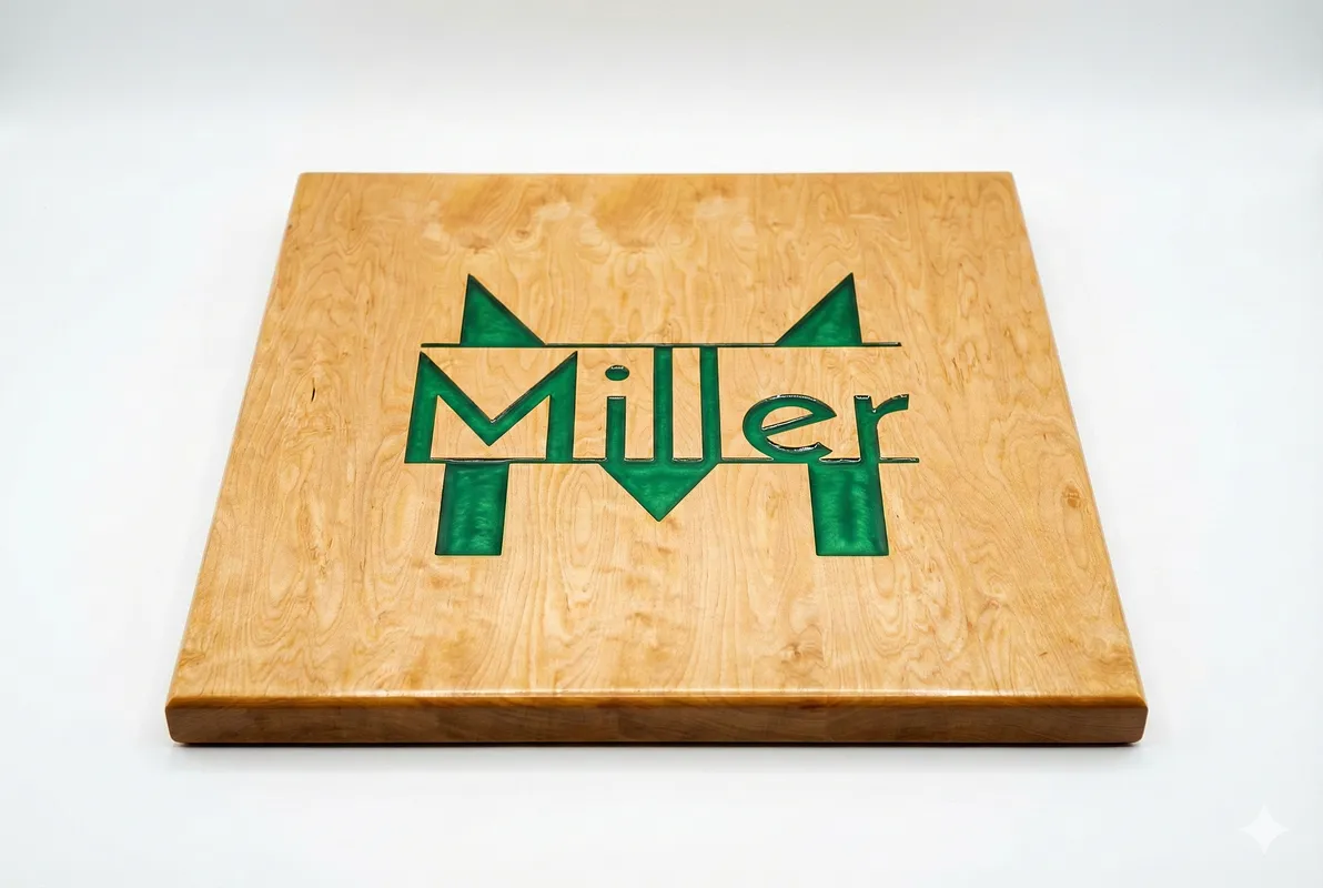Epoxy inlay cutting board with a split monogram design using Josefin font and plain style. The cut option is engraved using a V-bit, fill with green colored resin, sanded flush, and seal with food-safe tung oil.