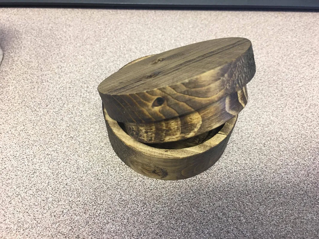 A circle box made from a 2x4 using a 1/4 router bit. Recommended: 1. set depth per pass to be 20% of over all thickness of the wood. 2. make sure you zero x and y at low as possible on the piece of wood.