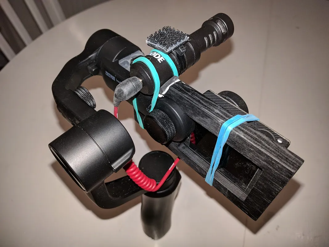 I use rubber bands to hold GoPro and VideoMicro in place, and some rubber padding for the microphone.