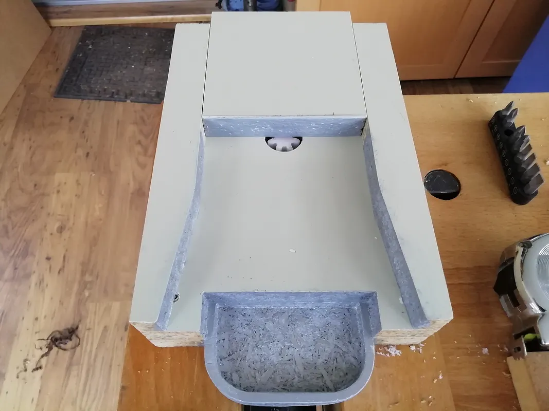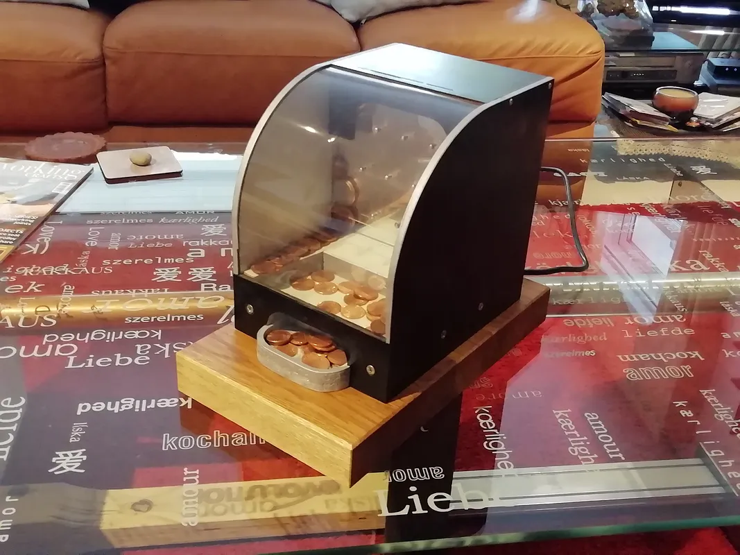 Motor Recess the back of the gear housing board to accept the motor drive, so that the gears all mesh freely, and fix the motor in place. Recess the top of the coin output board to accept the motor body and cabling. My motor extends right through, into a recess in the hardwood base, bored with a forstner bit. The mains cable should be securely fastened within the machine body, and any substituted metal parts in the build should be earthed.