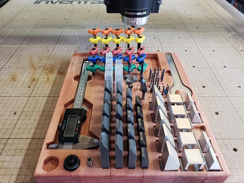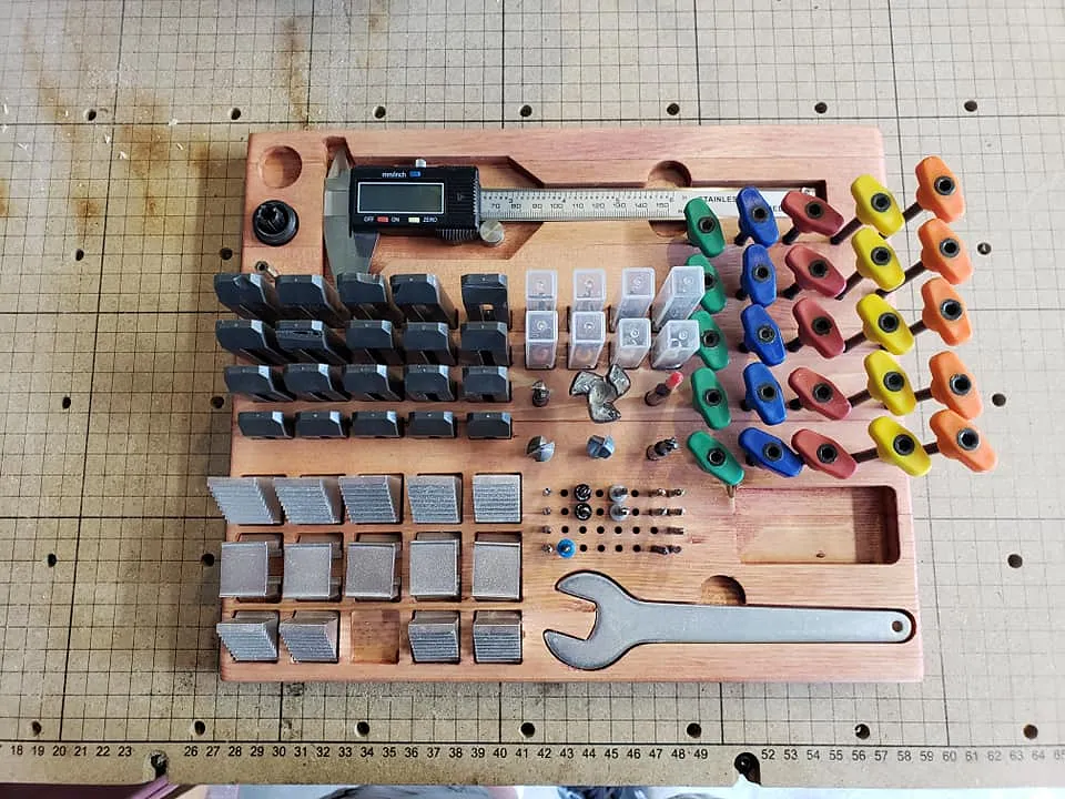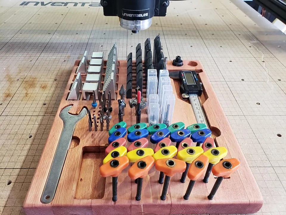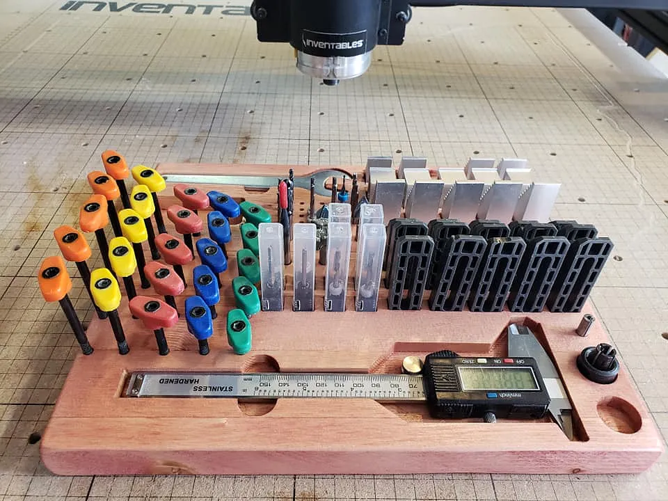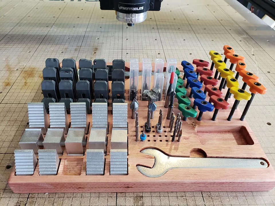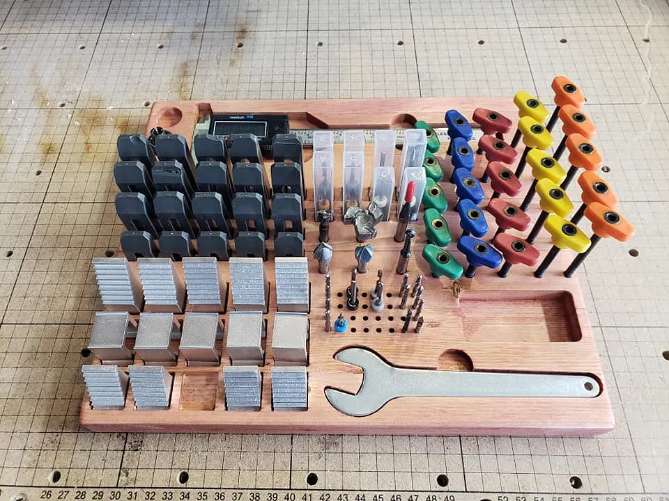 This is an all in one Clamp and Tool storage tray at 10 in x 12 in. It can hold up to 46 cutting tools . The tray is also equipped with a location for your 17 mm wrench and 150 mm caliper set. It will also hold all the hold down screws, clamps, and bases from the Inventables 3D clamp set.