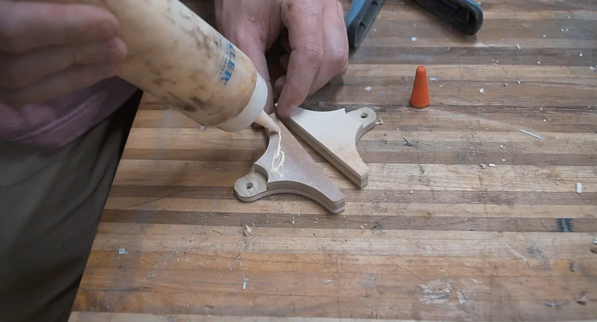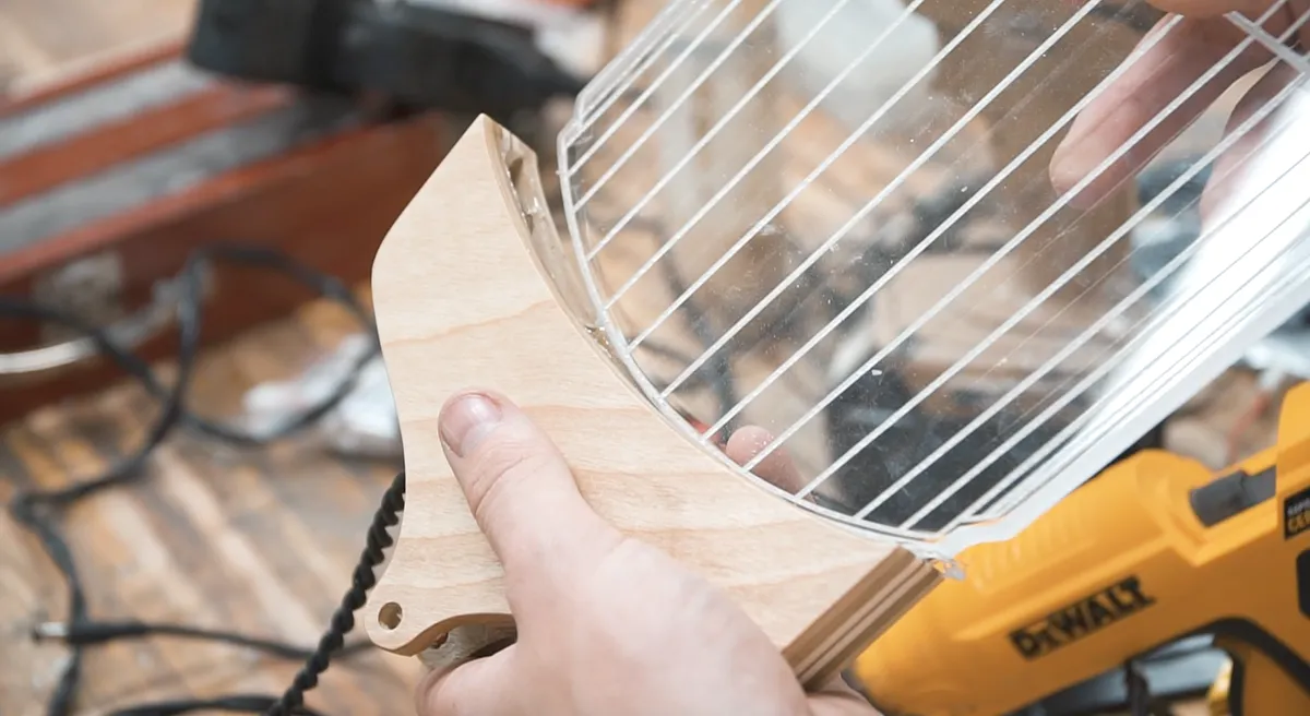 After that dried, we can assemble everything for the first time. The piece that attaches the arm to the base is just screwed on from the bottom. The arm was attached with 1/4 20 x 1 1/4” bolts and a wing nut so the arm can adjust to different angles. The top is attached the same way with the same size hardware.