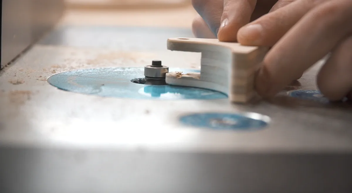 We are going to do the same process as with the wood and roughly cut out the acrylic with the bandsaw and then move over to the router table to flush trim it up.