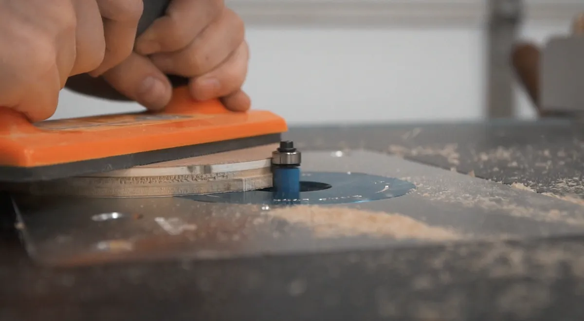 Now over on the router table, we first used a flush trim bit to to take away the extra bits we left when we cut the pieces out on the band saw.