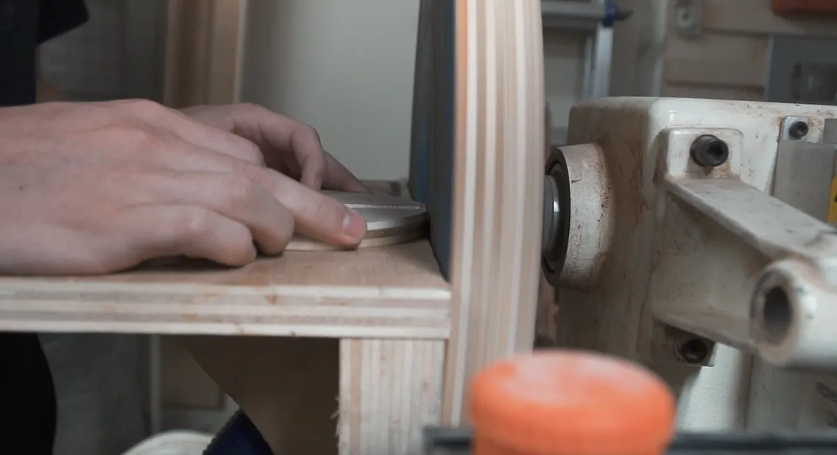 Next we used an oscillating belt sander and the disk sander to sand down and make the edges nice and smooth. On the base pieces we sanded a small section flat where the switch will stick out so it'll sit nicely and not want to roll around the rounded side.