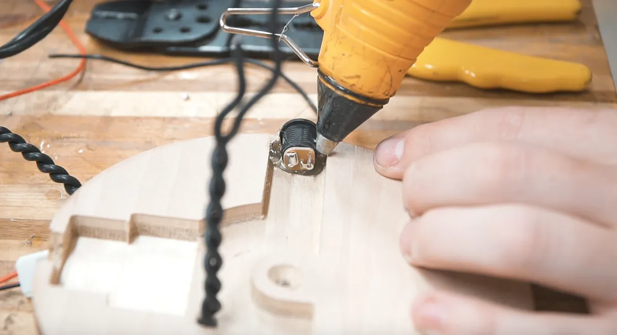 We added a little hot glue over the connection to keep it in place. Pro tip: Use compressed air to cool the hot glue quickly.