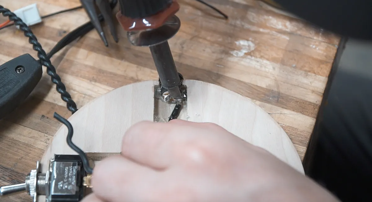 Cut a small piece of wire and solder it to the positive terminal on the power plug and the other end to the other terminal on the switch. Because we added the small wire between the power and the switch, this makes sure the light only turns on when switched on. If we had connected both wires coming through the base to the power plug, then the light would come on as soon as you plugged it in.