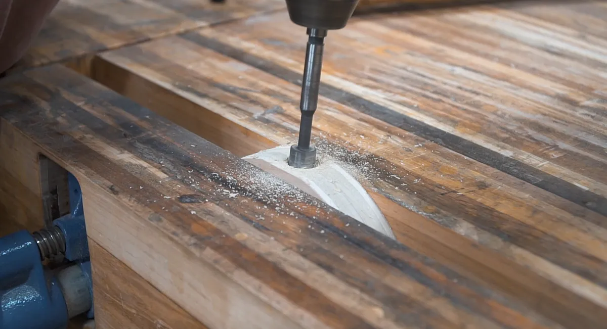 Now to make the holes for said switch. We used a half inch forstner bit and drilled through both pieces like how they would be when all done. To keep them from moving around, we put them in a vice and that worked really well.