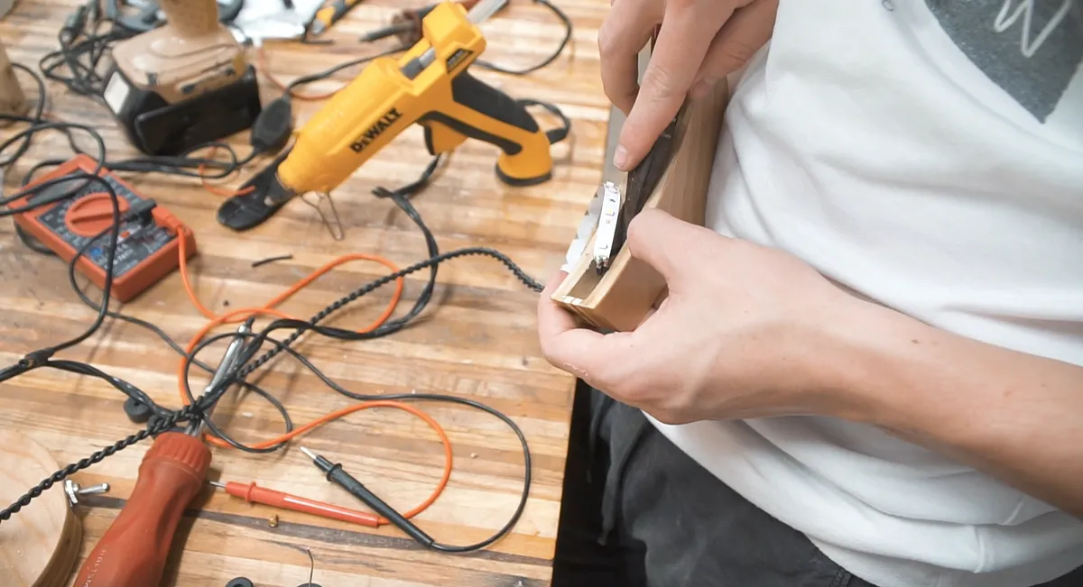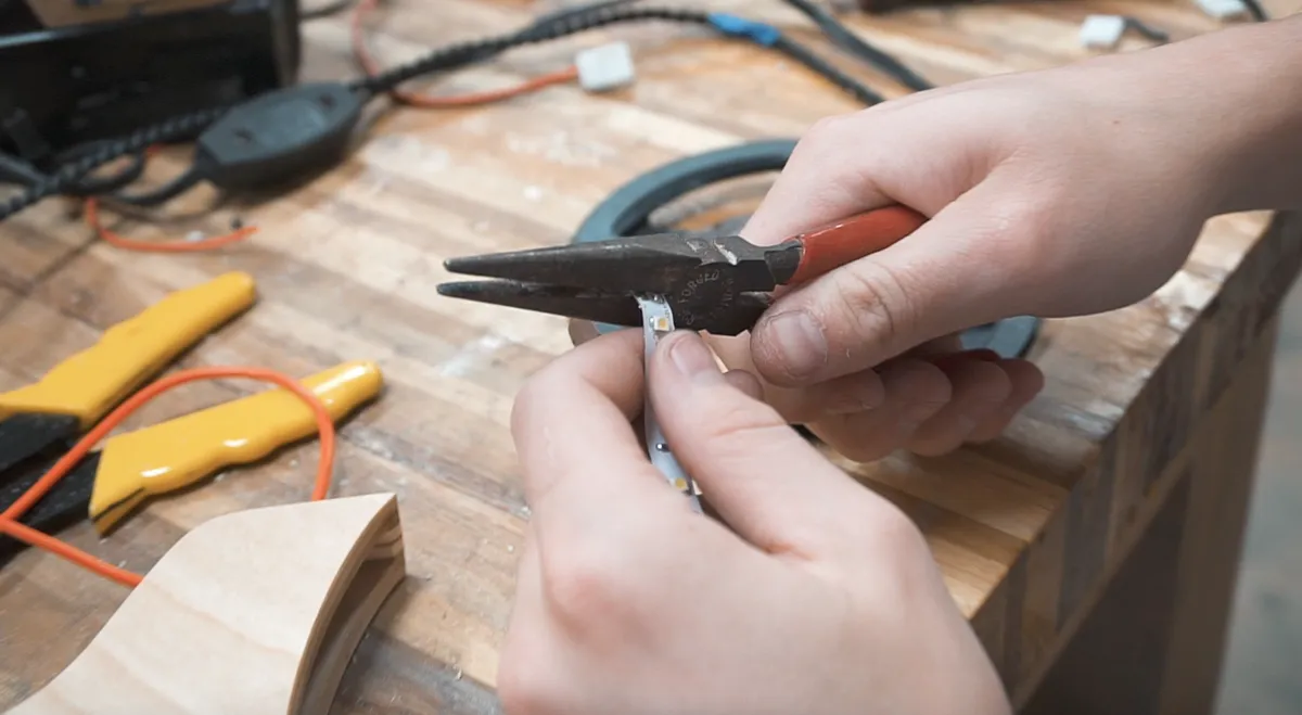 Run the wire through the hole in the top of the light hood, strip and add solder to the ends of the wire. We used an LED light strip that can be cut to any length. The last step in wiring is to solder the positive and ground wires to the LED strip.