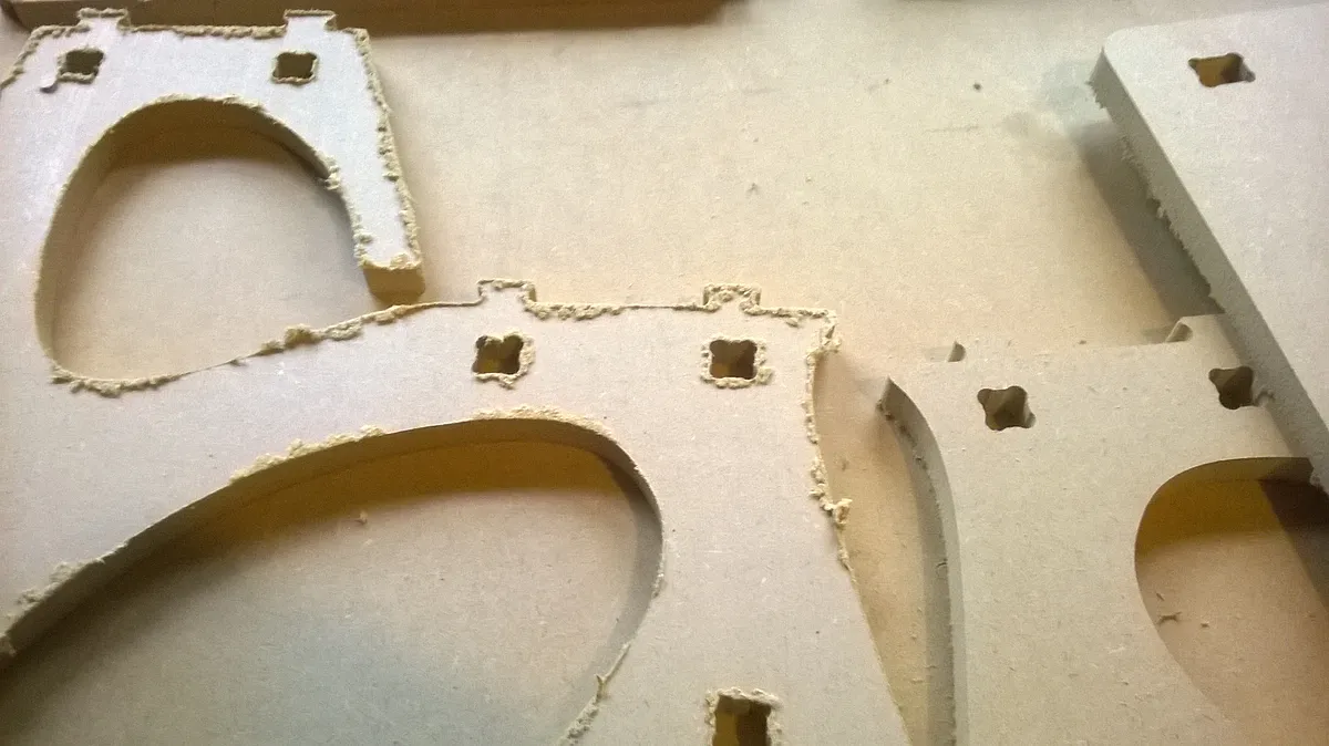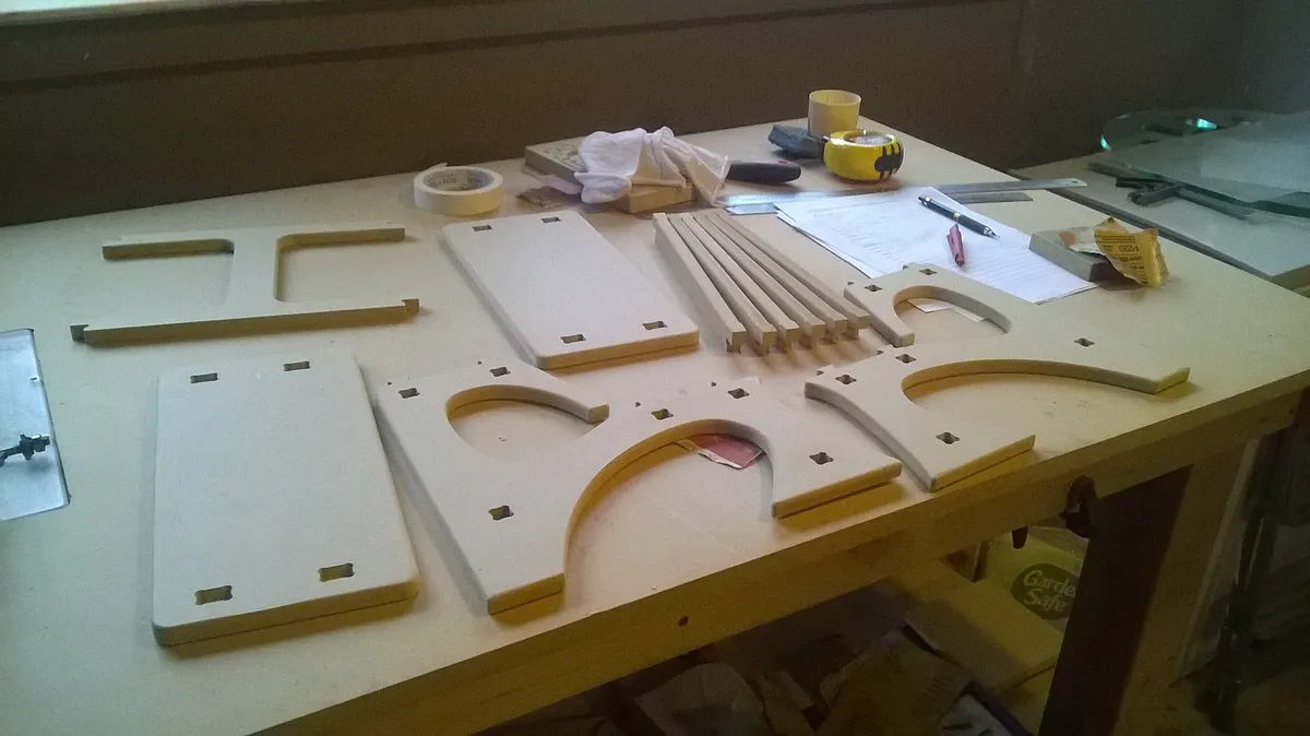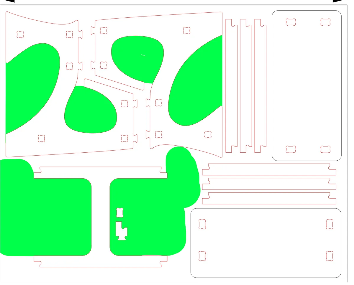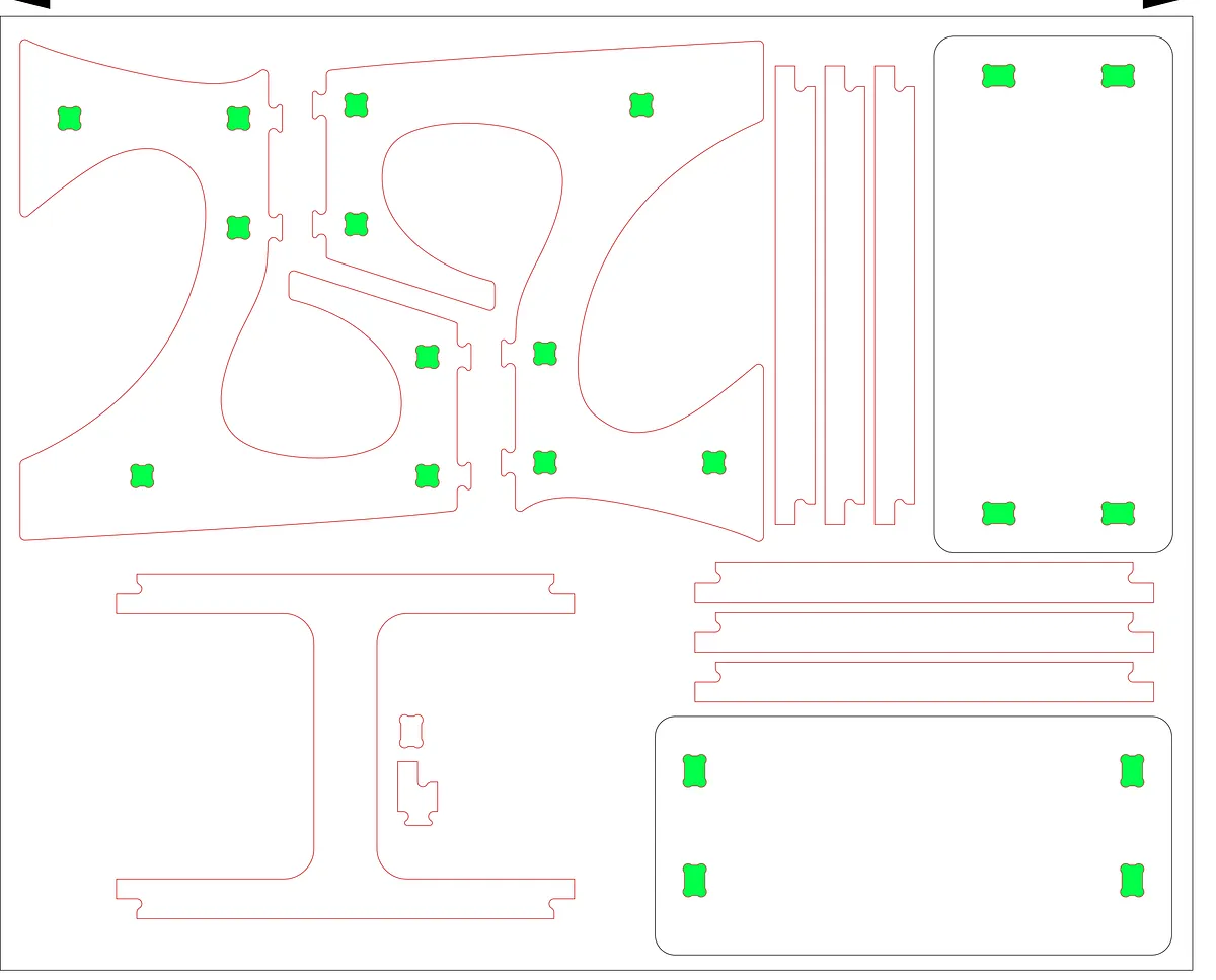 First, I have internal cuts made. Internal meaning anything inside of a part that will be cut from the stock material. This is important because if you cut the part from the stock before doing internal cuts, the part can fly off the table resulting in at best, a ruined part. At worst, a ruined you or spectator. Second, tape your stock down with double sided tape. The parts highlighted in green should be cut first.