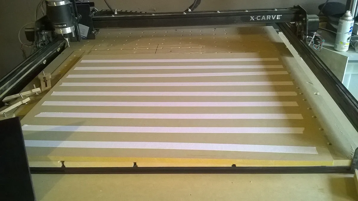 Time to prep for cut. Before clamping your board down, place some double sided tape on the bottom side to ensure that parts won’t liberate themselves from the work space. I usually place strips 1-2” apart depending upon the design.