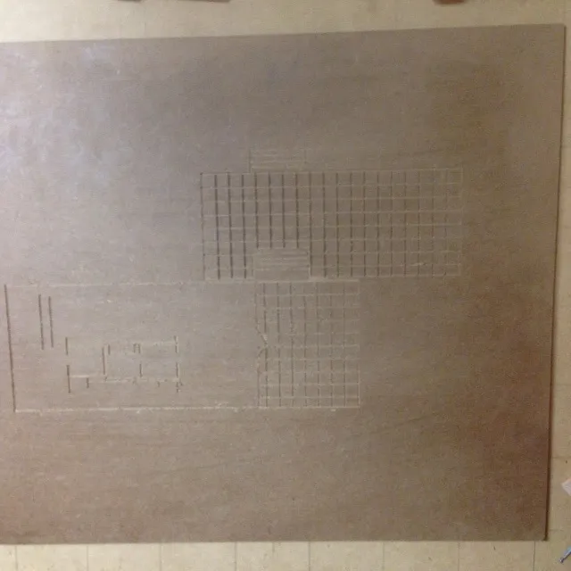 Project for all the architecture people out there. Carving of the Farnsworth House in 1/4" MDF. Used Vcarve to trace vectors of floor plan image and imported into Easel. Used settings of 15 in/min feed rate .0325 depth per pass.
