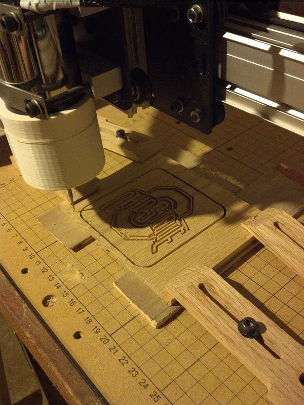 I used a 1/16" generic dremel-type bit to get the detail on the interior. You could probably use a 1/8" for the outline. If the edges chip, you could switch to a downcut but I didn't need to.