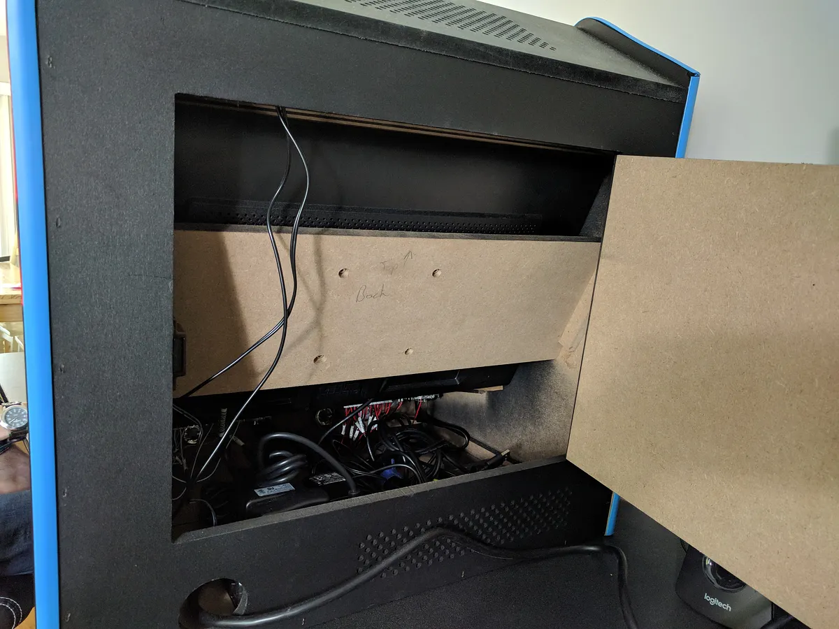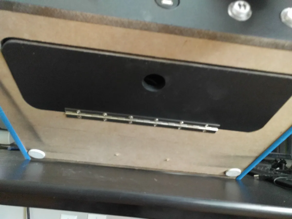 To access the wiring on the joystick panel, there is a cut-out panel on the bottom of the unit (first item in easel). I attached this with a piano hinge.